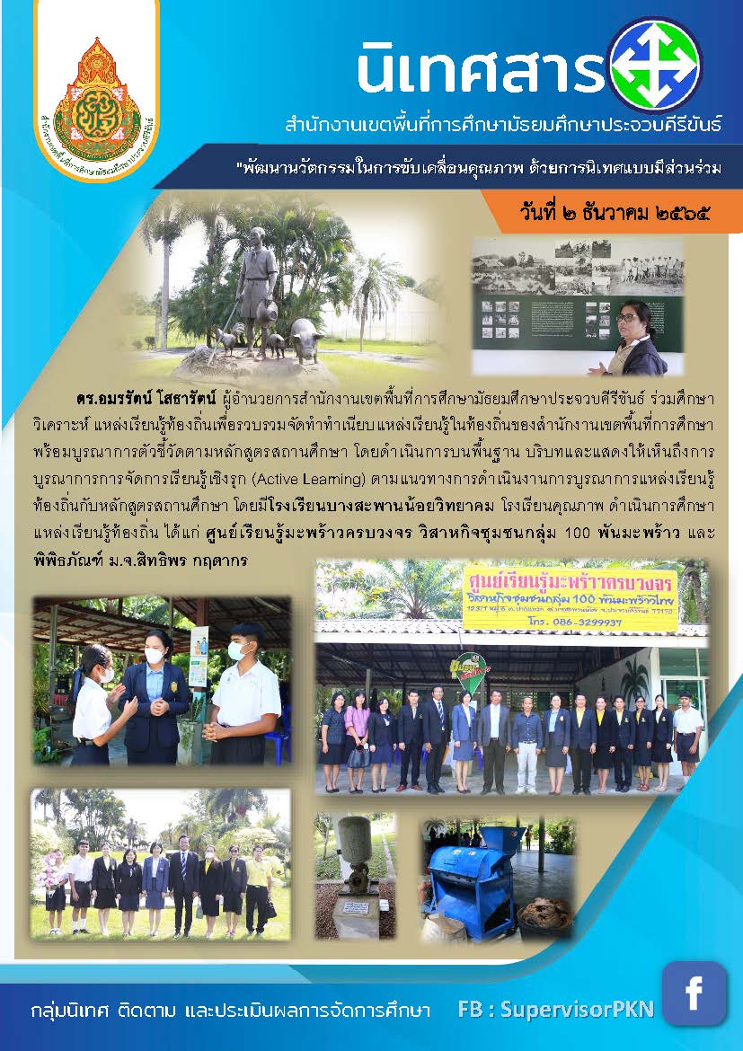ดร.อมรรัตน์ โสธารัตน์ ผู้อำนวยการสำนักงานเขตพื้นที่การศึกษามัธยมศึกษาประจวบดีรีขันธ์ ร่วมศึกษาวิเคราะห์ แหล่งเรียนรู้ท้องถิ่นเพื่อรวบรวม จัดทำทำเนียบ แหล่งเรียนรู้ในท้องถิ่นของสำนักงานเขตพื้นที่การศึกษาพร้อมบูรณา การตัวชี้วัดตามหลักสูตรสถานศึกษา โดยดำเนินการบนพื้นฐาน บริบทและแสดงให้เห็นถึงการบูรณาการการจัดการเรียนรู้เชิงรุก (Active Leaming) ตามแนวทางการดำเนินงานการบูรณา การแหล่งเรียนรู้ท้องถิ่นกับหลักสูตรสถานศึกษา โดยมีโรงเรียนบางสะ พานน้อยวิทยาคม โรงเรียนคุณภาพ ดำเนินการศึกษาแหล่งเรียนรู้ทั้องถิ่น ได้แก่ ศูนย์เรียนรู้มะพร้าวครบวงจร วิสาหกิจชุมซนกลุ่ม 100 พันมะพร้าว และพิพิธภัณฑ์ ม.จ.สิทธิพร กฤตากร