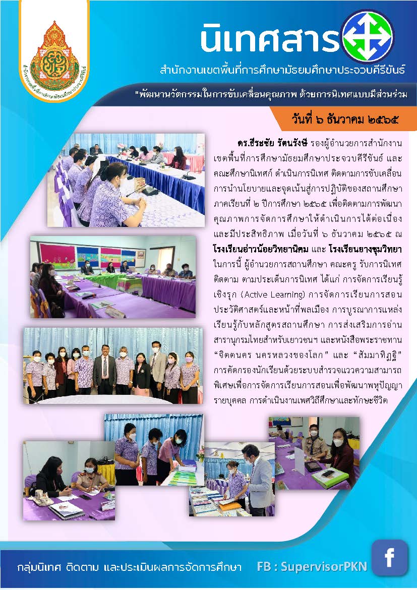 "วันที่ ๖ ธันวาคม ๒๕๖๕ ดร.ชีระชัย รัตนรังษี รองผู้อำนวยการสำนักงานเขตพื้นที่การศึกษามัธยมศึกษาประจวบดีรีขันธ์ และคณะศึกษานิเทศก์ ดำเนินการนิเทศ ติดตามการขับเคลื่อนการนำนโยบายและจุดเน้นสู่การปฏิบัติของสถานศึกษาภาคเรียนที่ ๒ ปีการศึกษา ๒๕๖๕ เพื่อติดตามการพัฒนาคุณภาพการจัดการศึกษาให้ดำเนินการได้ต่อเนื่องและมีประสิทธิภาพ เมื่อวันที่ - ธันวาคม ๒๕๖๕ ณ โรงเรียนอ่าวน้อยวิทยานิคม และ โรงเรียนยางชุมวิทยา ในการนี้ ผู้อำนวยการสถานศึกษา คณะครู รับการนิเทศ ติดตาม ตามประเต็นการนิเทศ ได้แก่ การจัดการเรียนรู้เชิงรุก (Active Learning) การจัดการเรียนการสอนประวัติศาสตร์และหน้าที่พลเมือง การบูรณาการแหล่งเรียนรู้กับหลักสูตรสถานศึกษา การส่งเสริมการอ่านสารานูกรมไทยสำหรับเยาวชนฯ และหนังสือพระราชทาน ""จิตตนตร นครหลวงของโลก"" และ ""ส้มมาทิฏฐิ"" การคัดกรองนักเรียนด้วยระบบสำรวจแววความสามารถพิเศษเพื่อการจัดการเรียนการสอนเพื่อพัฒนาพหุปัญญารายบุคคล การดำเนินงานเพศวิถีศึกษาและทักษะชีวิต"