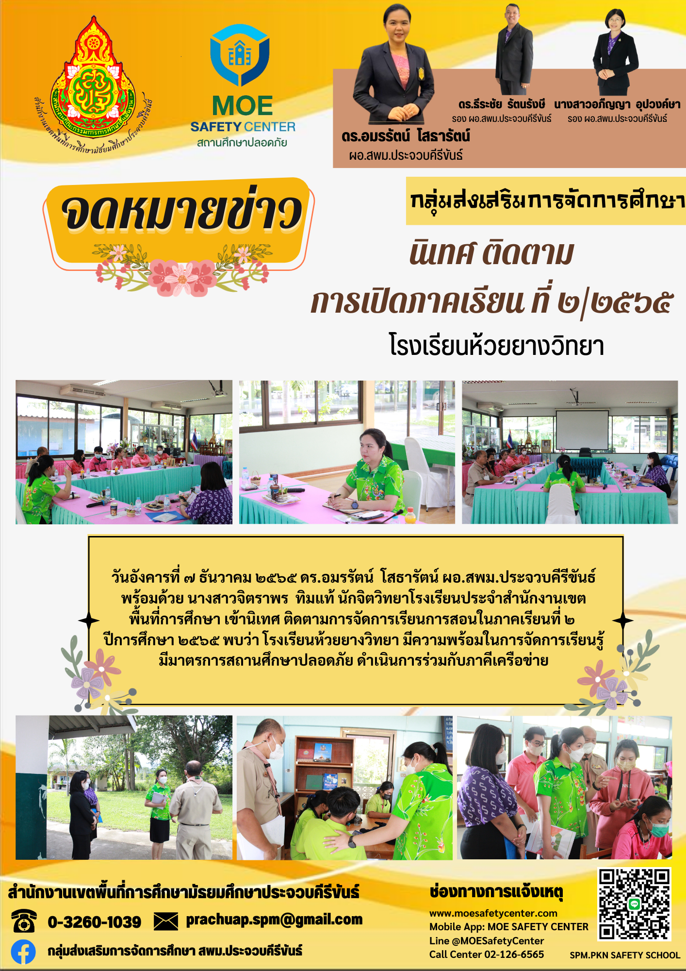วันอังคารที่ 7 ธันวาคม 2565 ดร.อมรรัตน์ โสธารัตน์ ผอ.สพม.ประจวบคีรีขันธ์ พร้อมด้วย นางสาวจิตราพร ทิมแท้ นักจิตวิทยาโรงเรียนประจำสำนักงานเขตพื้นที่การศึกษา เข้านิเทศ ติดตามการจัดการเรียนการสอนในภาคเรียนที่ 2 ปีการศึกษา 2565 พบว่า โรงเรียนห้วยยางวิทยา มีความพร้อมในการจัดการเรียนรู้มีมาตรการสถานศึกษาปลอดภัย ดำเนินการร่วมกับภาคีเครือข่าย