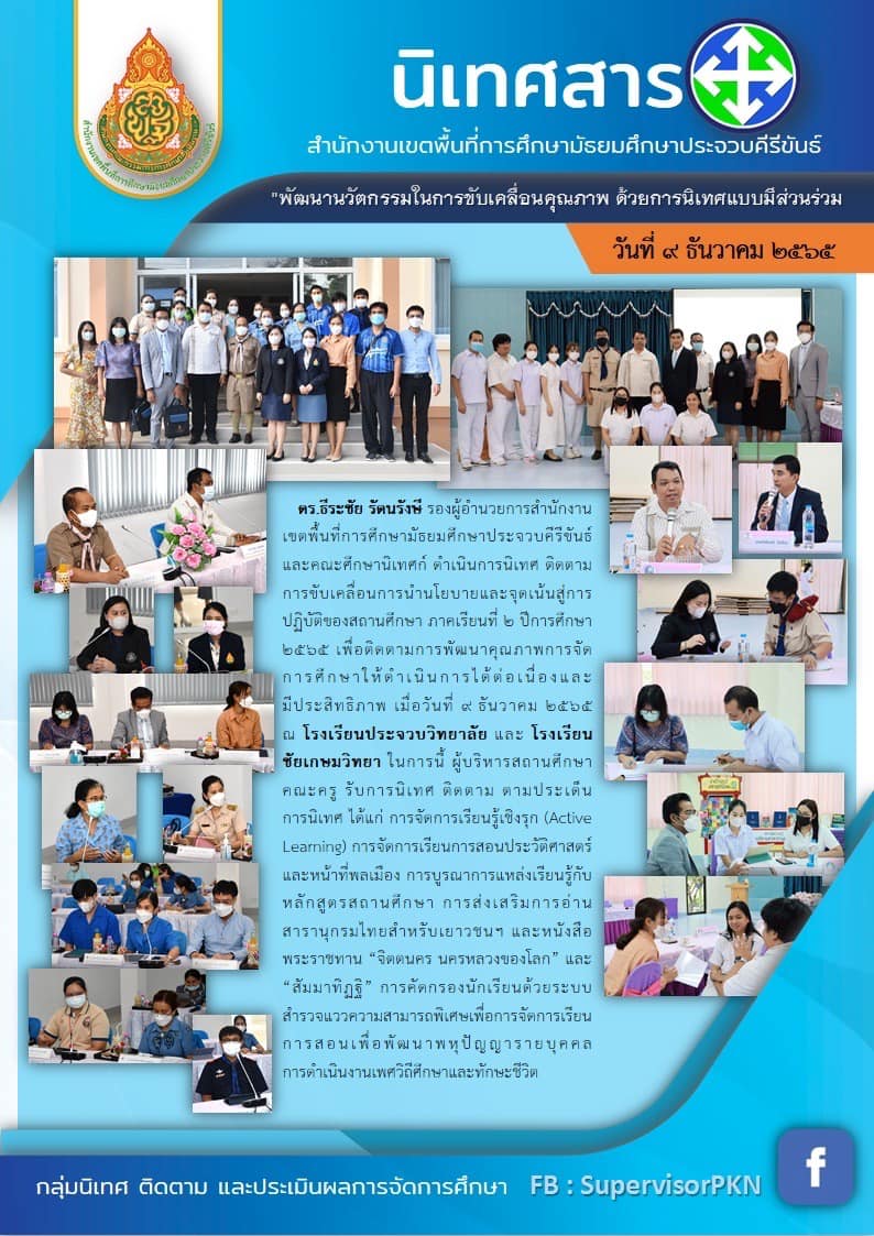 "ดร.ธีระชัย รัตนรังษี รองผู้อำนวยการสำนักงานเขตพื้นที่การศึกษามัธยมศึกษาประจวบคีรีขันธ์ และคณะศึกษานิเทศก์ ดำเนินการนิเทศ ติดตามการขับเคลื่อนการนำนโยบายและจุดเน้นสู่การปฏิบัติของสถานศึกษา ภาคเรียนที่ 2 ปีการศึกษา 2565 เพื่อติดตามการพัฒนาคุณภาพการจัดการศึกษาให้ดำเนินการได้ต่อเนื่องและ มีประสิทธิภาพ เมื่อวันที่ 9 ธันวาคม 2565 ณ โรงเรียนประจวบวิทยาลัย และ โรงเรียนชัยเกษมวิทยา ในการนี้ ผู้บริหารสถานศึกษาคณะครู รับการนิเทศ ติดตาม ตามประเด็นการนิเทศ ได้แก่ การจัตการเรียนรู้เชิงรุก (Active Leanning) การจัดการเรียนการสอนประวัติศาสดร์และหน้าที่พลเมือง การบูรณาการแหล่งเรียนรู้กับหลักสูตรสถานศึกษา การส่งเสริมการอ่านสารานุกรมไทยสำหรับเยาวชนฯ และหนังสือพระราชทาน ""จิตตนคร นครหลวงของโลก"" และ""สัมมาทิฏฐิ"" การคัดกรองนักเรียนด้วยระบบสำรวจแววความสามารถพิเศษเพื่อการจัตการเรียนการสอนเพื่อพัฒนาพหุปัญญารายบุคคลการดำเนินงานเพศวิถีศึกษาและทักษะชีวิต"