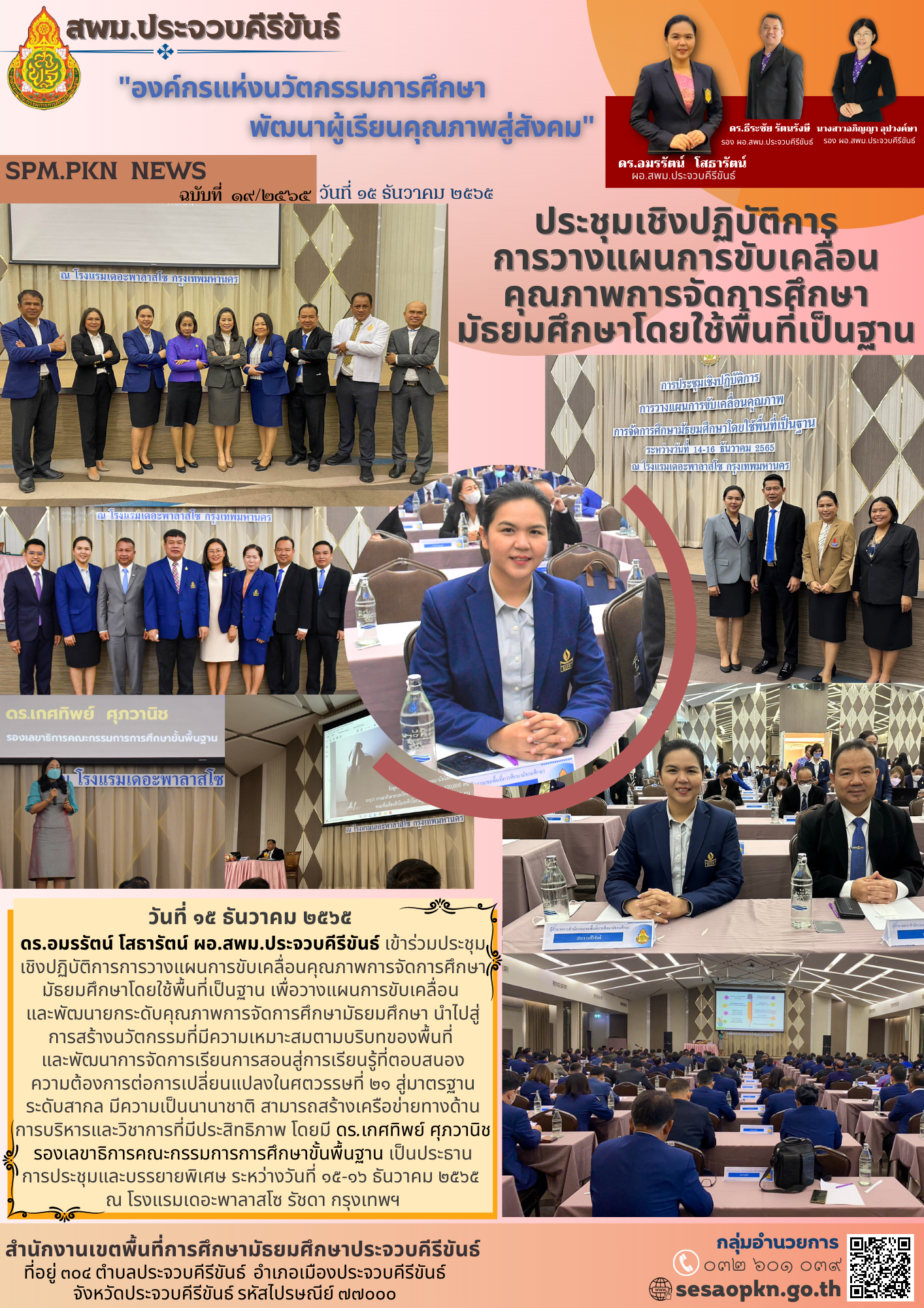 วันที่ 15 ธันวาคม 2565 ดร.อมรรัตน์ โสธารัตน์ ผอ.สพม.ประจวบคีรีขันธ์ เข้าร่วมประชุมเชิงปฏิบัติการการวางแผนการขับเคลื่อนคุณภาพการจัดการศึกษามัธยมศึกษาโดยใช้พื้นที่เป็นฐาน เพื่อวางแผนการขับเคลื่อนและพัฒนายกระดับคุณภาพการจัดการศึกษามัธยมศึกษา นำไปสู่การสร้างนวัตกรรมที่มีความเหมาะสมตามบริบทของพื้นที่และพัฒนาการจัดการเรียนการสอนสู่การเรียนรู้ที่ตอบสนองความต้องการต่อการเปลี่ยนแปลงในศตวรรษที่ 21 สู่มาตรฐานระดับสากล มีความเป็นนานาชาติ สามารถสร้างเครือข่ายทางด้านการบริหารและวิชาการที่มีประสิทธิภาพ โดยมี ดร.เกศทิพย์ ศุภวานิช รองเลขาธิการคณะกรรมการการศึกษาขั้นพื้นฐาน เป็นประธานการประชุมและบรรยายพิเศษ ระหว่างวันที่ 15-16 ธันวาคม 2565 ณ โรงแรมเดอะพาลาสโซ รัชดา กรุงเทพฯ