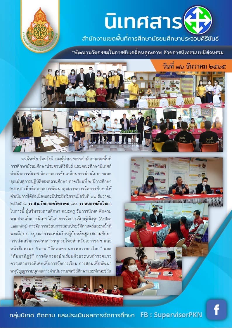 "ดร.ธีระชัย รัตนรังษี รองผู้อำนวยการสำนักงานเขตพื้นที่การศึกษามัธยมศึกษาประจวบคีรีขันธ์ และคณะศึกษานิเทศก์ ดำเนินการนิเทศ ติดตามการขับเคลื่อนการนำนโยบายและจุดเน้นสู่การปฏิบัติของสถานศึกษา ภาคเรียนที่ 2 ปีการศึกษา 2565 เพื่อติดตามการพัฒนาคุณภาพการจัดการศึกษาให้ดำเนินการได้ต่อเนื่องและมีประสิทธิภาพเมื่อวันที่ 12 ธันวาคม 2565 ณ รร.สามร้อยยอดวิทยาคม และ รร.หนองพลับวิทยา ในการนี้ ผู้บริหารสถานศึกษา คณะครู รับการนิเทศ ติดตาม ตามประเด็นการนิเทศ ได้แก่ การจัดการเรียนรู้เชิงรุก (Active Learning) การจัดการเรียนการสอนประวัติศาสตร์และหน้าที่พลเมือง การบูรณาการแหล่งเรียนรู้กับหลักสูตรสถานศึกษาการส่งเสริมการอ่านสารานุกรมไทยสำหรับเยาวชนฯ และหนังสือพระราชทาน ""จิตตนคร นครหลวงของโลก"" และ ""สัมมาทิฏฐิ"" การคัดกรองนักเรียนด้วยระบบสำรวจแววความสามารถพิเศษเพื่อการจัดการเรียน การสอนเพื่อพัฒนาพหุปัญญารายบุคคลการตำเนินงานเพศวิถีศึกษาและทักษะชีวิต"