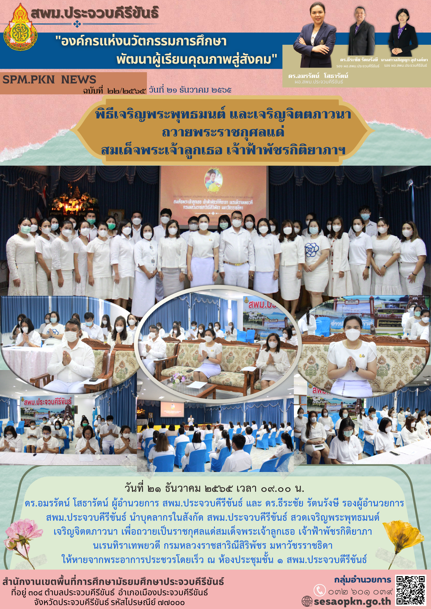 วันที่ ๒๑ ธันวาคม ๒๕๖๕ เวลา ๑๙.๐๐ น. ดร.อมรรัตน์ โสธารัตน์ ผู้อำนวยการ สพม.ประจวบคีรีขันธ์ และ ดร.ธีระชัย รัตนรังษี รองผู้อำนวยการ สพม.ประจวบคีรีขันธ์ นำบุคลากรในสังกัด สพม.ประจวบคีรีขันธ์ สวดเจริญพระพุทธมนต์เจริญจิตตภาวนา เพื่อถวายเป็นราชกุศลแด่สมเด็จพระเจ้าลูกเธอ เจ้าฟ้าพัชรกิติยาภานเรนทิราเทพยวดี กรมหลวงราชสาริณีสิริพัชร มหาวัชรราชธิดา ให้หายจากพระอาการประชวรโดยเร็ว ณ ห้องประชุมชั้น ๑ สพม.ประจวบคีรีขันธ์