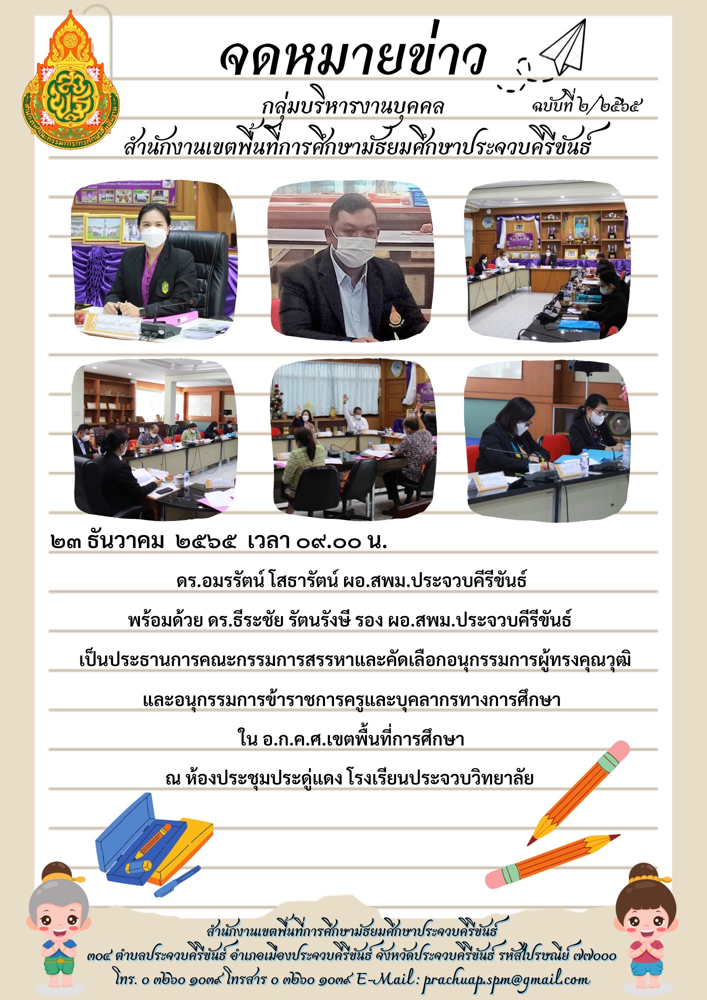 23 ธันวาคม 2565 เวลา 9.00 น. ดร.อมรรัตน์ โสธารัตน์ ผอ.สพม.ประจวบคีรีขันธ์ พร้อมด้วย ดร.ธีระชัย รัตนรังษี รอง ผอ.สพม.ประจวบคีรีขันธ์ เป็นประธานการคณะกรรมการสรรหาและคัดเลือกอนุกรรมการผู้ทรงคุณวุฒิ และอนุกรรมการข้าราชการครูและบุคลากรทางการศึกษาใน อ.ก.ค.ศ.เขตพื้นที่การศึกษา ณ ห้องประชุมประดู่แดง โรงเรียนประจวบวิทยาลัย