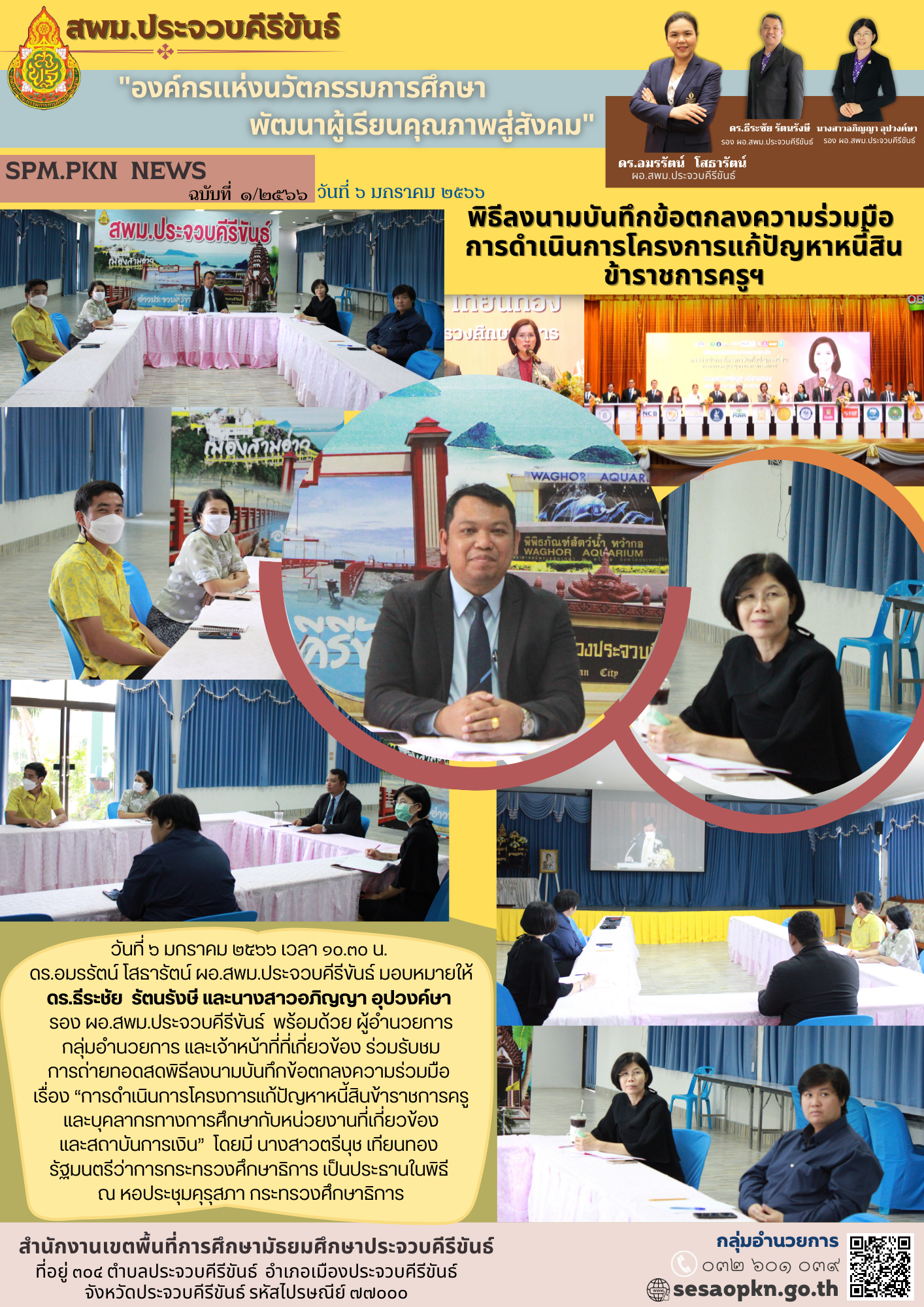 วันที่ 6 มกราคม 2566 เวลา 10.30 น. ดร.อมรรัตน์ โสรารัตน์ ผอ.สพม.ประจวบคีรีขันธ์ มอบหมายให้ ดร.ธีระชัย รัตนรังษี และนางสาวอภิญญา อุปวงค์ษา รอง ผอ.สพม.ประจวบคีรีขันธ์ พร้อมด้วย ผู้อำนวยการกลุ่มอำนวยการ และเจ้าหน้าที่ที่เกี่ยวข้อง ร่วมรับชมการถ่ายทอดสดพิรีลงนามบันทึกข้อตกลงความร่วมมือเรื่อง การดำเนินการโครงการแก้ปัญหาหนี้สินข้าราชการครูและบุคลากรทางการศึกษากับหน่วยงานที่เกี่ยวข้องและสถาบันการเงิน โดยมี นางสาวตรีนุช เทียนทอง รัฐมนตรีว่าการกระทรวงศึกษาธิการ เป็นประธานในพิธี ณ หอประชุมคุรุสภา กระทรวงศึกษาธิการ