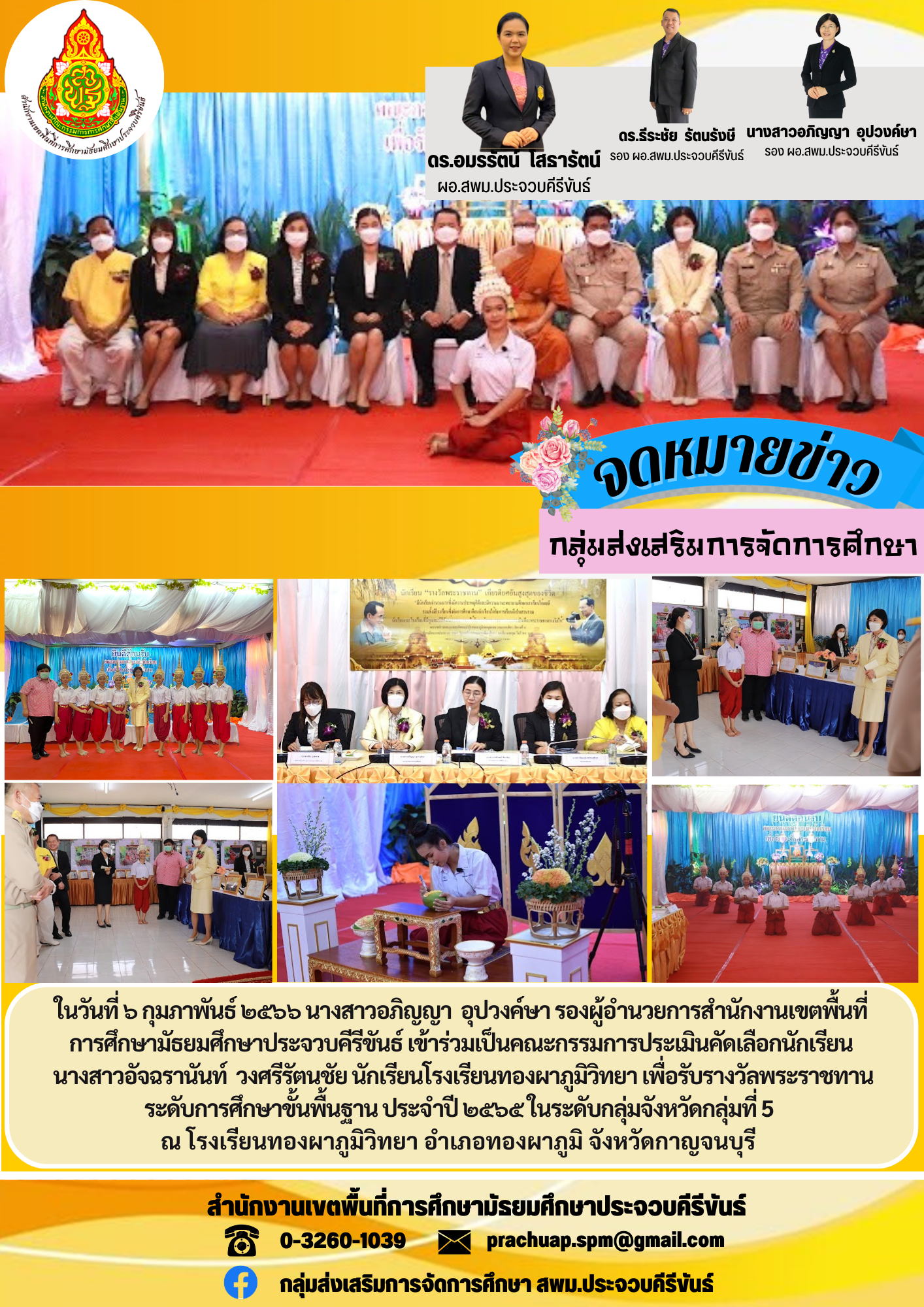 ในวันที่ 6 กุมภาพันธ์ 2566 นางสาวอภิญญา อุปวงค์ษา รองผู้อำนวยการสำนักงานเขตพื้นที่การศึกษามัธยมศึกษาประจวบคืรีขันธ์ เข้าร่วมเป็นคณะกรรมการประเมินคัดเลือกนักเรียน นางสาวอัจฉรานันท์ วงศรีรัตนชัย นักเรียนโรงเรียนทองผาภูมิวิทยา เพื่อรับรางวัลพระราชทานระดับการศึกษาขั้นพื้นฐาน ประจำปี ๒๕๖๕ ในระดับกลุ่มจังหวัดกลุ่มที่ 5 ณ โรงเรียนทองผาภูมิวิทยา อำเภอทองผาภูมิ จังหวัดกาญจนบุรี