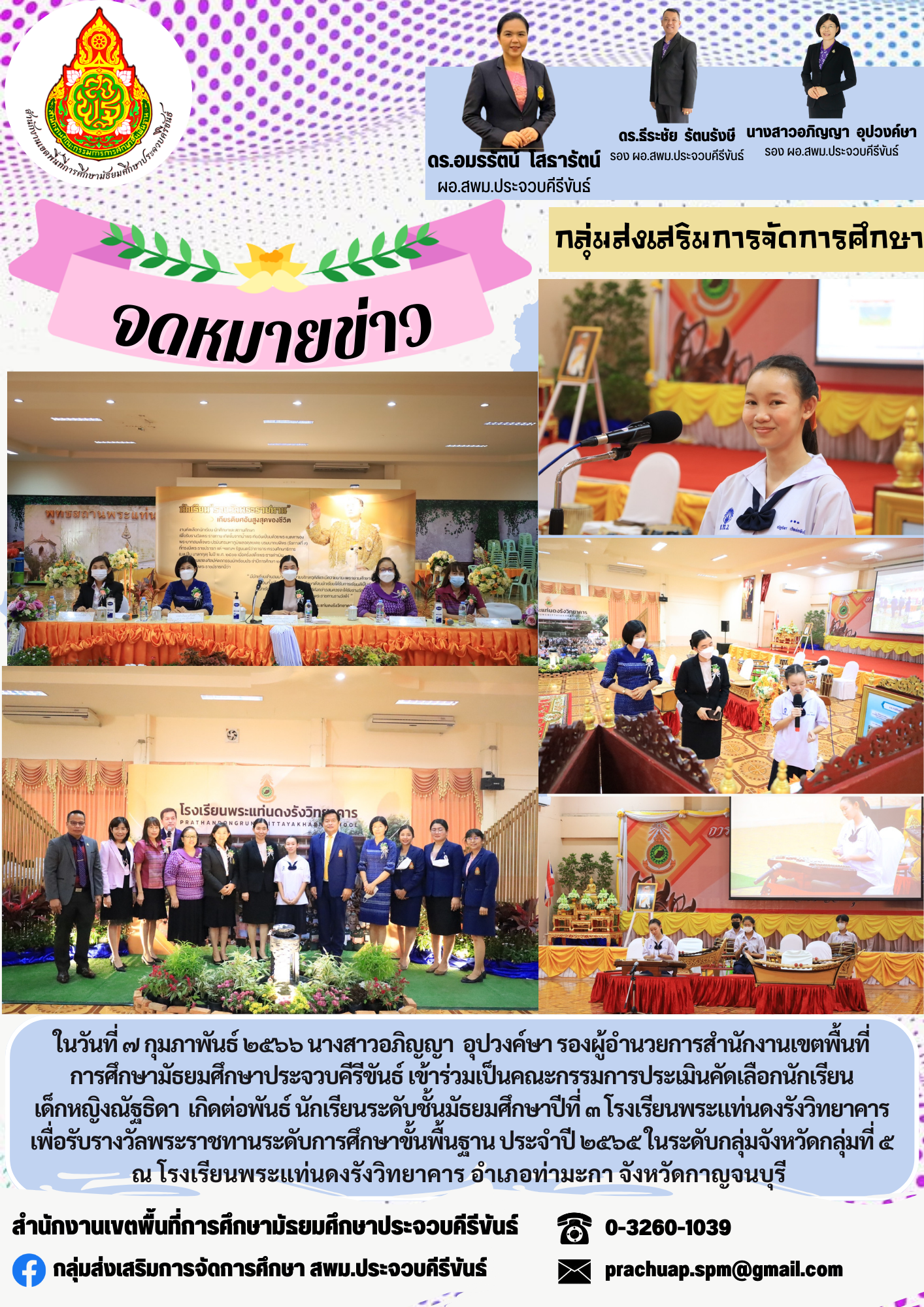 ในวันที่ 7 กุมภาพันธ์ 2566 นางสาวอภิญญา อุปวงค์ษา รองผู้อำนวยการสำนักงานเขตพื้นที่การศึกษามัธยมศึกษาประจวบคีรีขันธ์ เข้าร่วมเป็นคณะกรรมการประเมินคัดเลือกนักเรียน เด็กหญิงณัฐธิดา เกิดต่อพันธ์ นักเรียนระดับชั้นมัธยมศึกษาปีที่ 3 โรงเรียนพระแท่นดงรังวิทยาคาร เพื่อรับรางวัลพระราชทานระดับการศึกษาชั้นพื้นฐาน ประจำปี ๒๕๖๕ ในระดับกลุ่มจังหวัดกลุ่มที่ ๕ ณ โรงเรียนพระแท่นดงรังวิทยาคาร อำเภอท่ามะกา จังหวัดกาญจนบุรี