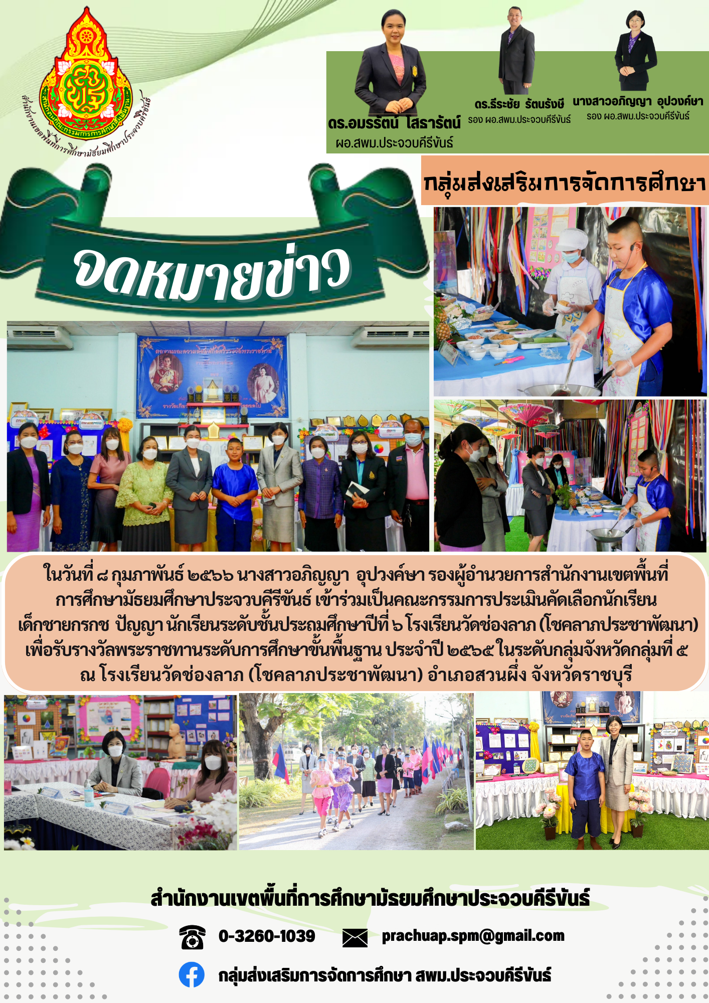 ในวันที่ 8 กุมภาพันธ์ 2566 นางสาวอภิญญา อุปวงค์ษา รองผู้อำนวยการสำนักงานเขตพื้นที่การศึกษามัธยมศึกษาประจวบคีรีขันธ์ เข้าร่วมเป็นคณะกรรมการประเมินคัดเลือกนักเรียน เด็กชายกรกช ปัญญา นักเรียนระดับชั้นประถมศึกษาปีที่ 6โรงเรียนวัดช่องลาภ (โชคลาภประชาพัฒนา) เพื่อรับรางวัลพระราชทานระดับการศึกษาขั้นพื้นฐาน ประจำปี 2565 ในระดับกลุ่มจังหวัดกลุ่มที่ 5 ณ โรงเรียนวัดช่องลาภ (โชคลาภประชาพัฒนา) อำเภอสวนผึ้ง จังหวั่ดราชบุรี
