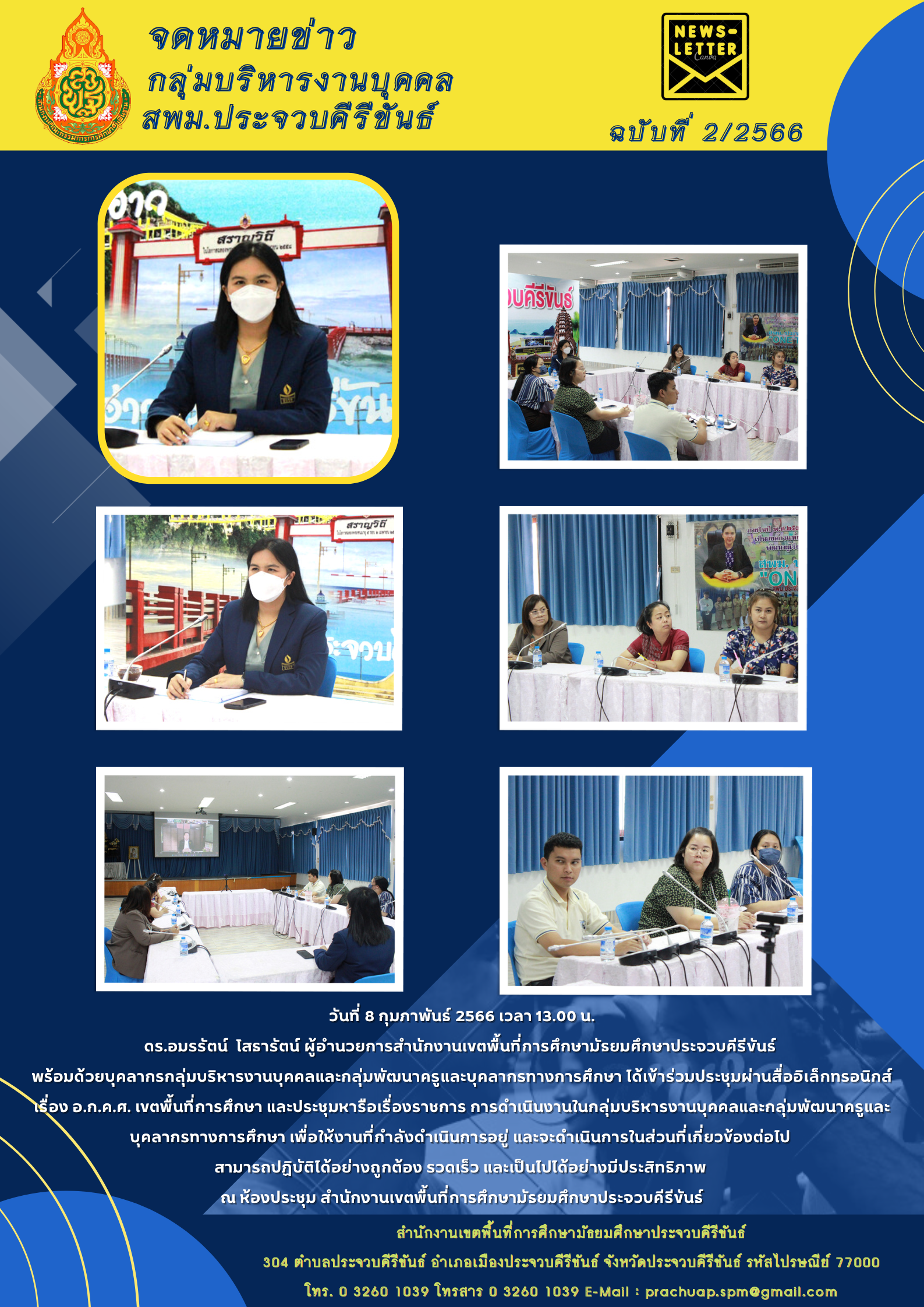 วันที่ 8 กุมภาพันธ์ 2566 เวลา 13.00 น. ดร.อมรรัตน์ โสรารัตน์ ผู้อำนวยการสำนักงานเขตพื้นที่การศึกษามัธยมศึกษาประจวบคีรีขันธ์ พร้อมด้วยบุคลากรกลุ่มบริหารงานบุคคลและ กลุ่มพัฒนาครูและบุคลากรทางการศึกษา ได้เข้าร่วมประชุมผ่านสื่ออิเล็กทรอนิกส์เรื่อง อ.ก.ค.ศ. เขตพื้นที่การศึกษา และประชุมหารือเรื่องราชการ การดำเนินงานในกลุ่มบริหารงานบุคคลและกลุ่มพัฒนาครูและ บุคลากรทางการศึกษา เพื่อให้งานที่กำลังดำเนินการอยู่ และจะดำเนินการในส่วนที่เกี่ยวข้องต่อไปสามารถปฏิบัติได้อย่างถูกต้อง รวดเร็ว และเป็นไปได้อย่างมีประสิทธิภาพ ณ ห้องประชุม สำนักงานเขตพื้นที่การศึกษามัธยมศึกษาประจวบคีรีขันธ์