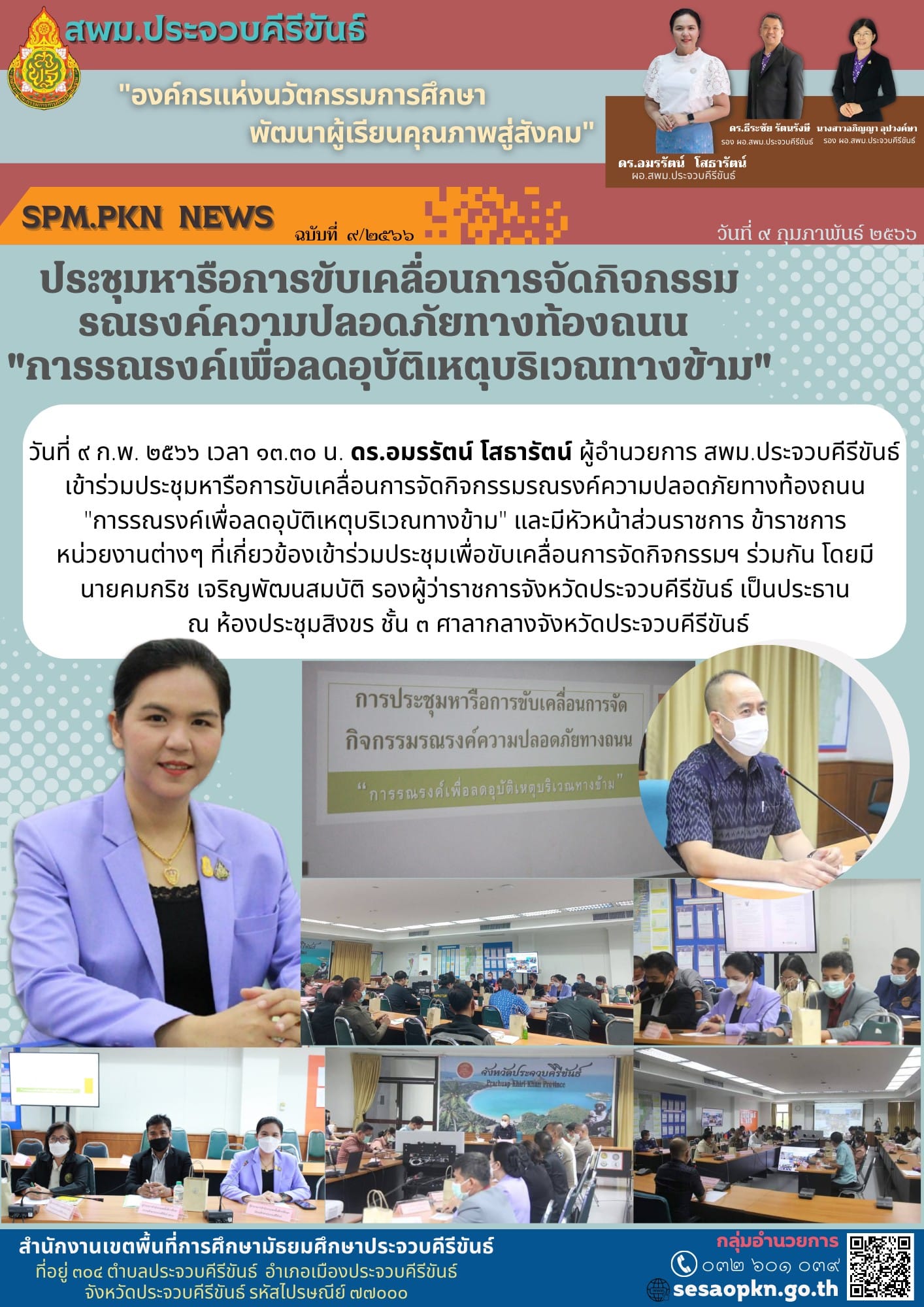 วันที่ ๙ ก.พ. ๒๕๖๖ เวลา ๑๓.๓๐ น. ดร.อมรรัตน์ โสธารัตน์ ผู้อำนวยการ สพม.ประจวบคีรีขันธ์ เข้าร่วมประชุมหารือการขับเคลื่อนการจัดกิจกรรมรณรงค์ความปลอดภัยทางท้องถนน การรณรงค์เพื่อลดอุบัติเหตุบริเวณทางข้าม และมีหัวหน้าส่วนราชการ ข้าราชการ หน่วยงานต่างๆ ที่เกี่ยวข้องเข้าร่วมประชุมเพื่อขับเคลื่อนการจัดกิจกรรมฯ ร่วมกัน โดยมี นายคมกริช เจริญพัฒนสมบัติ รองผู้ว่าราชการจังหวัดประจวบคีรีขันธ์ เป็นประธาน ณ ห้องประชุมสิงขร ชั้น ๓ ศาลากลางจังหวัดประจวบคีรีขันธ์