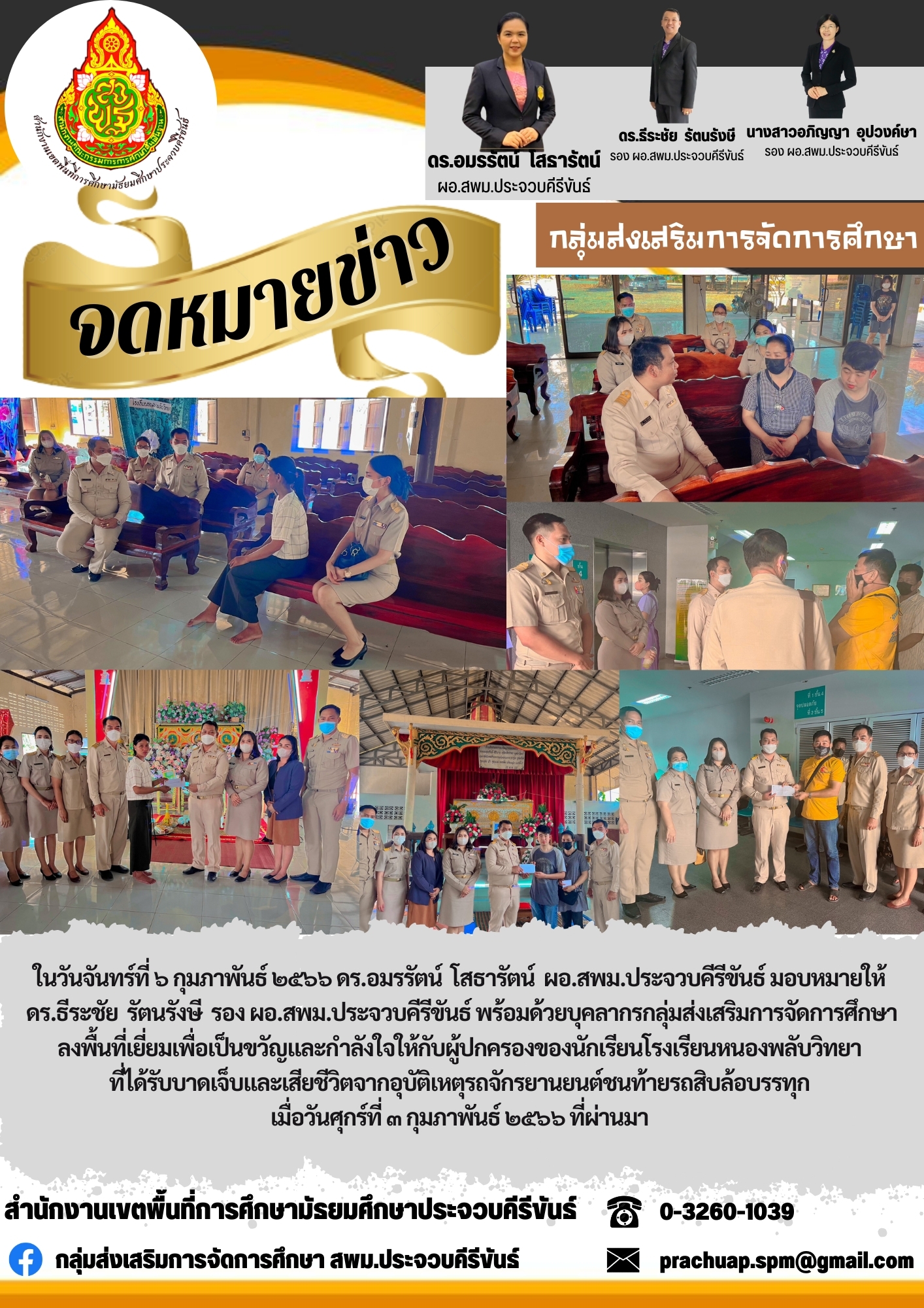 ในวันจันทร์ที่ ๖ กุมภาพันธ์ ๒๕๖๖ ดร.อมรรัตน์ โสธารัตน์ ผอ.สพม.ประจวบคีรีขันธ์ มอบหมายให้ ดร.ธีระชัย รัตนรังษี รอง ผอ.สพม.ประจวบคีรีขันธ์ พร้อมด้วยบุคลากรกลุ่มส่งเสริมการจัดการศึกษา ลงพื้นที่เยี่ยมเพื่อเป็นขวัญและกำลังใจให้กับผู้ปกครองของนักเรียนโรงเรียนหนองพลับวิทยา ที่ได้รับบาดเจ็บและเสียชีวิตจากอุบัติเหตุรถจักรยานยนต์ชนท้ายรถสิบล้อบรรทุก เมื่อวันศุกร์ที่ ๓ กุมภาพันธ์ ๒๕๖๖ ที่ผ่านมา