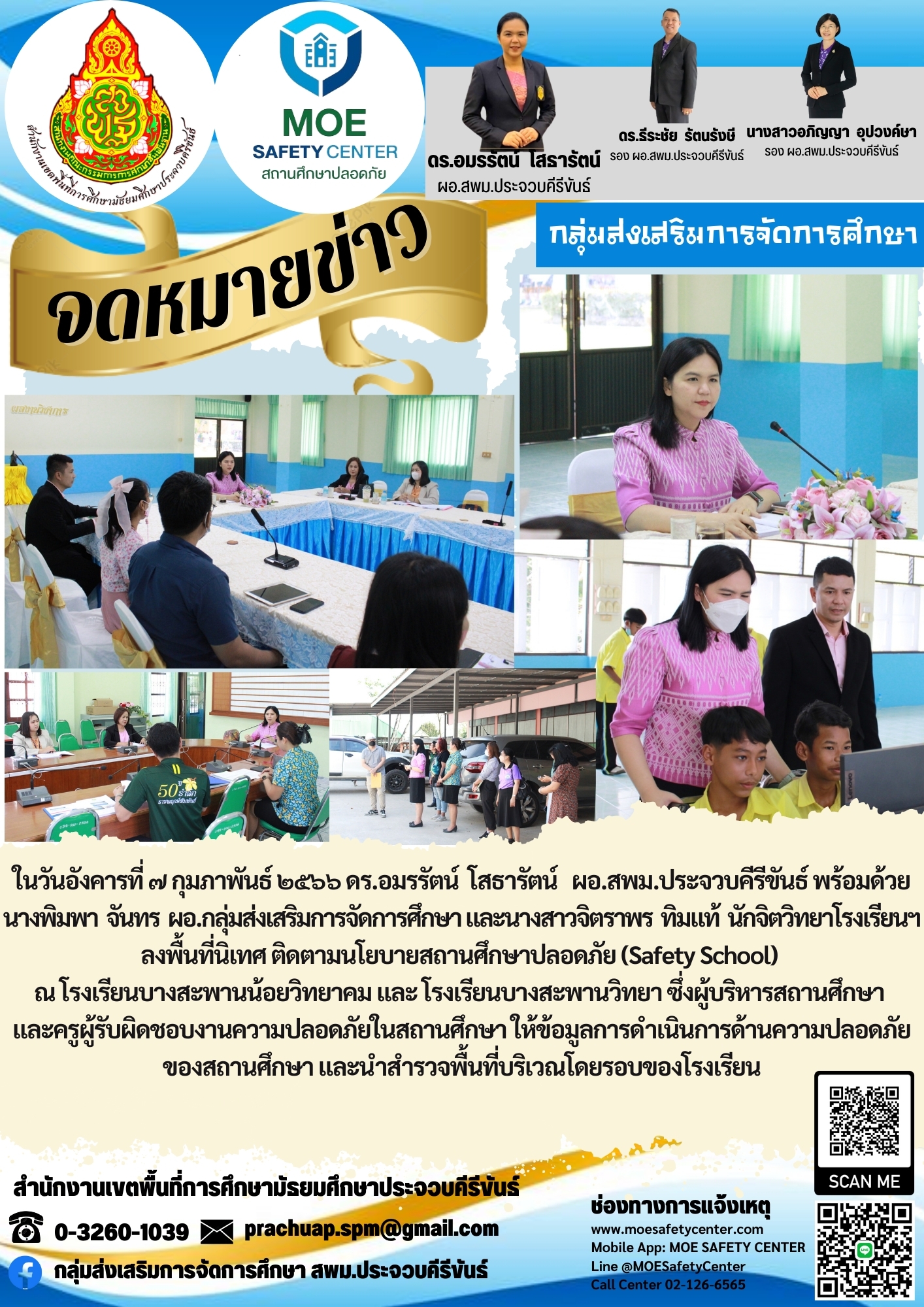 ในวันอังคารที่ ๗ กุมภาพันธ์ ๒๕๖๖ ดร.อมรรัตน์ โสธารัตน์ ผอ.สพม.ประจวบคีรีขันธ์ พร้อมด้วย นางพิมพา จันทร ผอ.กลุ่มส่งเสริมการจัดการศึกษา และนางสาวจิตราพร ทิมแท้ นักจิตวิทยาโรงเรียนฯ ลงพื้นที่นิเทศ ติดตามนโยบายสถานศึกษาปลอดภัย (Safety School) ณโรงเรียนบางสะพานน้อยวิทยาคม และโรงเรียนบางสะพานวิทยา ซึ่งผู้บริหารสถานศึกษา และครูผู้รับผิดชอบงานความปลอดภัยในสถานศึกษา ให้ข้อมูลการดำเนินการด้านความปลอดภัยของสถานุศึกษา และนำสำรวจพื้นที่บริเวณโดยรอบของโรงเรียน