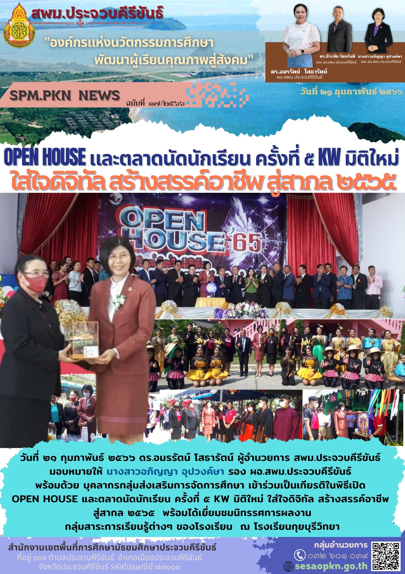 วันที่ ๒๑ กุมภาพันธ์ ๒๕๖๖ ดร.อมรรัตน์ โสธารัตน์ ผู้อำนวยการ สพม.ประจวบคีรีขันธ์ มอบหมายให้ นางสาวอภิญญา อุปวงค์ษา รอง ผอ.สพม.ประจวบคีรีขันธ์ พร้อมด้วย บุคลากรกลุ่มส่งเสริมการจัดการศึกษา เข้าร่วมเป็นเกียรติในพิธีเปิด OPEN HOUSE และตลาดนัดนักเรียน ครั้งที่ ๕ KW มิติใหม่ ใส่ใจดิจิทัล สร้างสรรค์อาชีพสู่สากล ๒๕๖๕ พร้อมได้เยี่ยมชมนิทรรศการผลงานกลุ่มสาระการเรียนรู้ต่างๆ ของโรงเรียน ณ โรงเรียนกุยบุรีวิทยา
