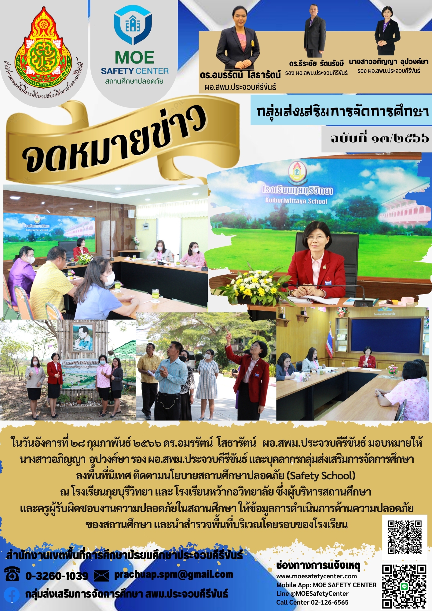 ในวันอังคารที่ ๒๘ กุมภาพันธ์ ๒๕๖๖ ดร.อมรรัตน์ โสธรัตน์ ผอ.สพม.ประจวบคีรีขันธ์ มอบหมายให้ นางสาวอภิญญา อุปวงค์ษา รอง ผอ.สพม.ประจวบคีรีขันธ์ และบุคลากรกลุ่มส่งเสริมการจัดการศึกษาลงพื้นที่นิเทศ ติดตามนโยบายสถานศึกษาปลอดภัย (Safety School) ณโรงเรียนกุยบุรีวิทยา และโรงเรียนหว้ากอวิทยาลัย ซึ่งผู้บริหารสถานศึกษา และครูผู้รับผิดชอบงานความปลอดภัยในสถนศึกษาให้ข้อมูลการดำเนินการด้านความปลอดภัยของสถานศึกษา และนำสำรวจพื้นที่บริเวณโดยรอบของโรงเรียน