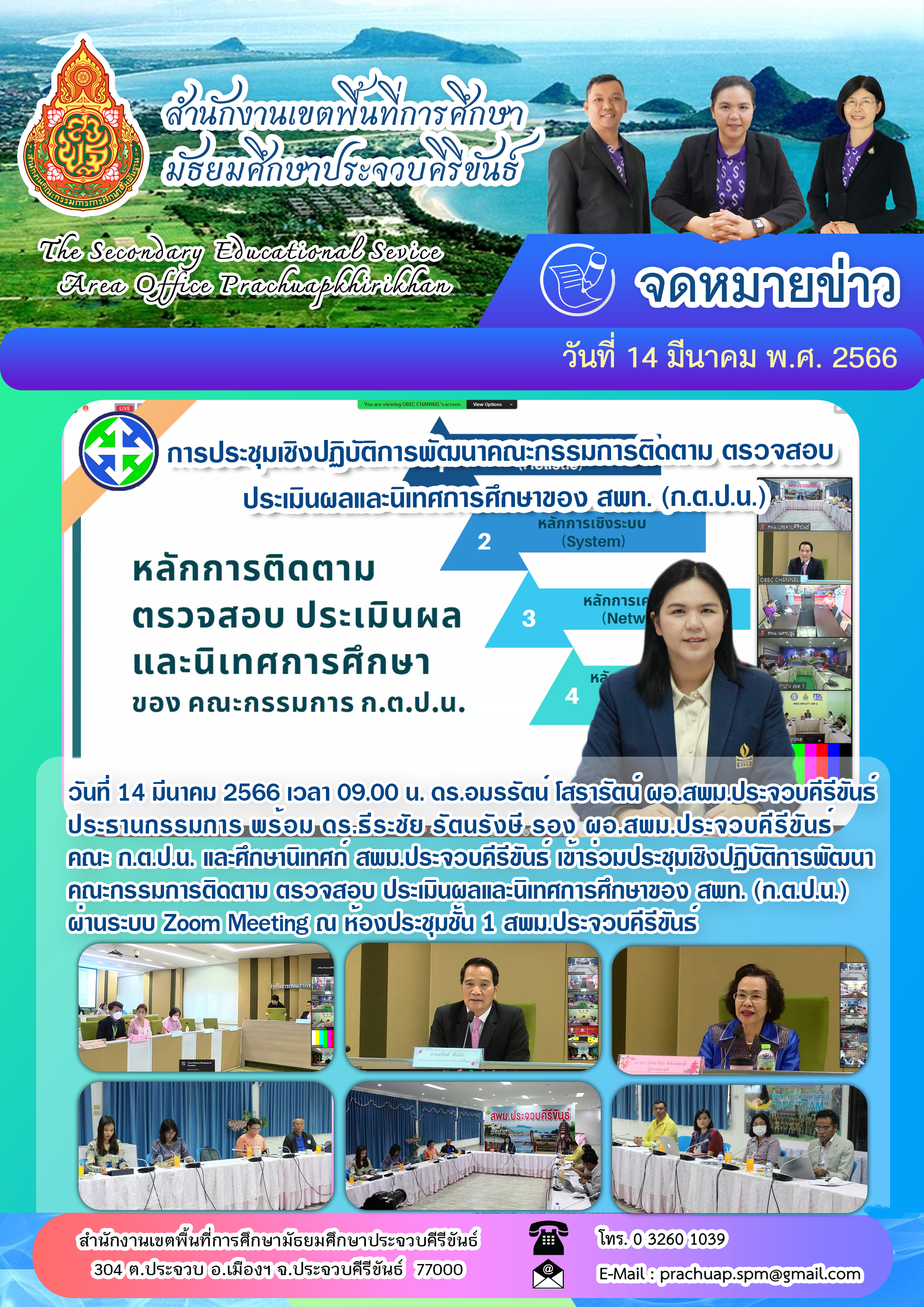 วันที่ 14 มีนาคม 2566 เวลา 09.00 น. ดร.อมรรัตน์ โสรารัตน์ ผอ.สพม.ประจวบคีรีขันธ์ ประธานกรรมการ พร้อม ดร.ธีระชัย รัตนรังษี รอง ผอ.สพม.ประจวบคีรีขันธ์ คณะ ก.ต.ป.น. และศึกษานิเทศก์ สพม.ประจวบคีรีขันธ์ เข้าร่วมประชุมเชิงปฏิบัติการพัฒนาคณะกรรมการติดตาม ตรวจสอบ ประเมินผลและนิเทศการศึกษาของ สพท. (ก.ต.ป.น.) ผ่านระบบ Zoom Meeting ณ ห้องประชุมชั้น 1 สพม.ประจวบคีรีขันธ์