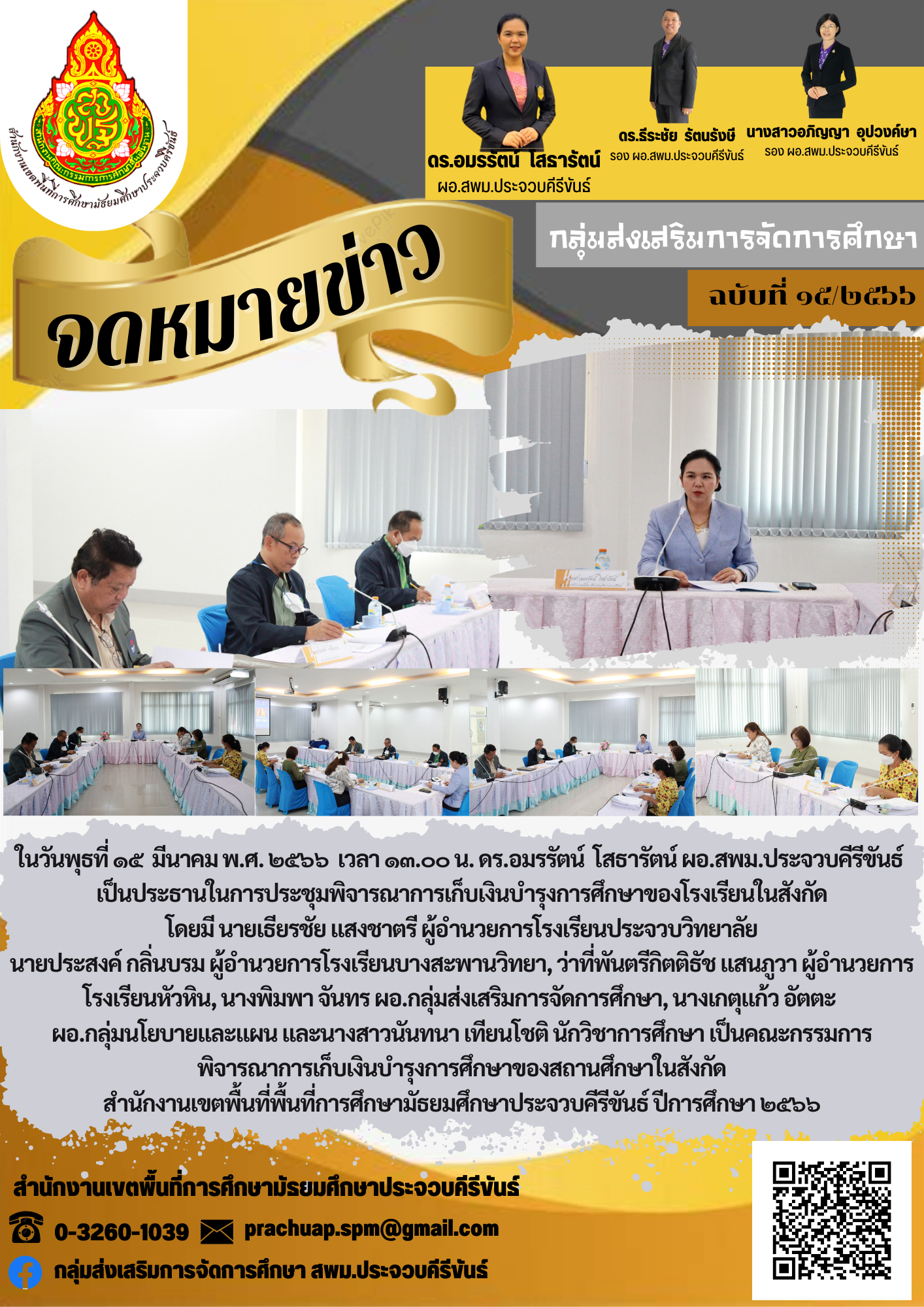 ในวันพุธที่ ๑๕ มีนาคม พ.ศ. ๒๕๖๖ เวลา ๑๓.๐๐ น. ดร.อมรรัตน์ โสธารัตน์ ผอ.สพม.ประจวบคีรีขันธ์ เป็นประธานในการประชุมพิจารณาการเก็บเงินบำรุงการศึกษาของโรงเรียนในสังกัด โดยมี นายเธียรชัย แสงชาตรี ผู้อำนวยการโรงเรียนประจวบวิทยาลัย นายประสงค์ กลิ่นบรม ผู้อำนวยการโรงเรียนบางสะพานวิทยา, ว่าที่พันตรีกิตติธัช แสนภูวา ผู้อำนวยการ โรงเรียนหัวหิน, นางพิมพา จันทร ผอ.กลุ่มส่งเสริมการจัดการศึกษา, นางเกตุแก้ว อัตตะ ผอ.กลุ่มนโยบายและแผน และนางสาวนันทนา เทียนโชติ นักวิชาการศึกษา เป็นคณะกรรมการ พิจารณาการเก็บเงินบำรุงการศึกษาของสถานศึกษาในสังกัด สำนักงานเขตพื้นที่พื้นที่การศึกษามัธยมศึกษาประจวบคีรีขันธ์ ปีการศึกษา ๒๕๖๖