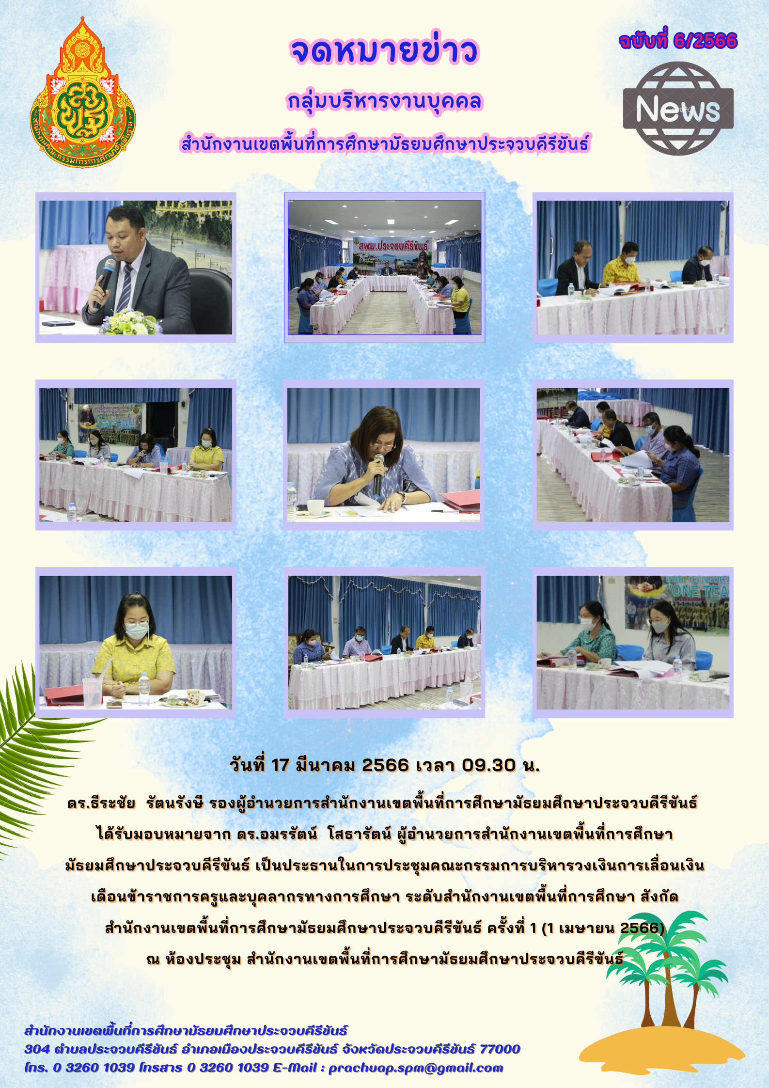 วันที่ 17 มีนาคม 2566 เวลา 09.30 น. ดร.ธีระชัย รัตนรังษี รองผู้อำนวยการสำนักงานเขตพื้นที่การศึกษามัธยมศึกษาประจวบคีรีขันธ์ ได้รับมอบหมายจาก ดร.อมรรัตน์ โสธารัตน์ ผู้อำนวยการสำนักงานเขตพื้นที่การศึกษามัธยมศึกษาประจวบคีรีขันธ์ เป็นประธานในการประชุมคณะกรรมการบริหารวงเงินการเลื่อนเงินเดือนข้าราชการครูและบุคลากรทางการศึกษา ระดับสำนักงานเขตพื้นที่การศึกษา สังกัดสำนักงานเขตพื้นที่การศึกษามัธยมศึกษาประจวบคีรีขันธ์ ครั้งที่ 1 (1 เมษายน 2566) ณ ห้องประชุม สำนักงานเขตพื้นที่การศึกษามัธยมศึกษาประจวบคีรีขันธ์