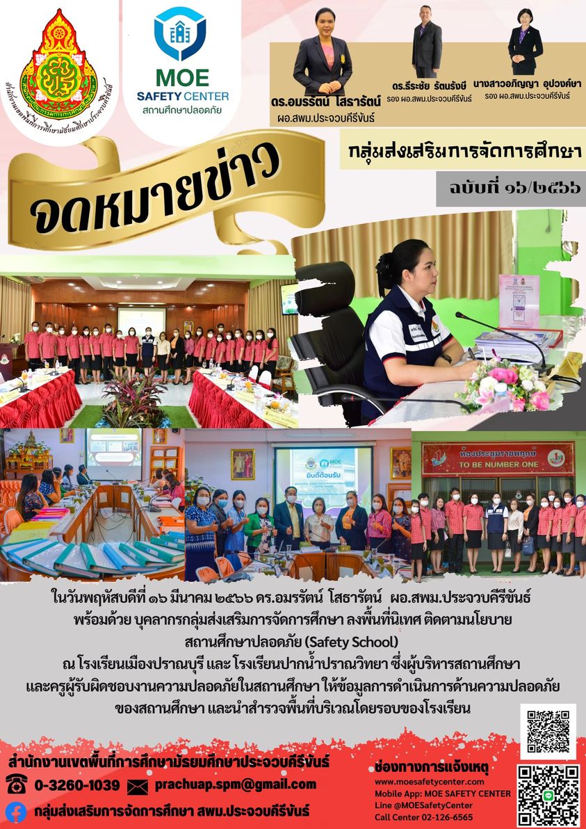 ในวันพฤหัสบดีที่ ๑๖ มีนาคม ๒๕๖๖ ดร.อมรรัตน์ โสธารัตน์ ผอ.สพม.ประจวบคีรีขันธ์ พร้อมด้วย บุคลากรกลุ่มส่งเสริมการจัดการศึกษาลงพื้นที่นิเทศ ติดตามนโยบายสถานศึกษาปลอดภัย (Safety School) ณ โรงเรียนเมืองปราณบุรี และ โรงเรียนปากน้ำปราณวิทยา ซึ่งผู้บริหารสถานศึกษา และครูผู้รับผิดชอบงานความปลอดภัยในสถานศึกษา ให้ข้อมูลการดำเนินการด้านความปลอดภัยของสถานศึกษา และนำสำรวจพื้นที่บริเวณโดยรอบของโรงเรียน