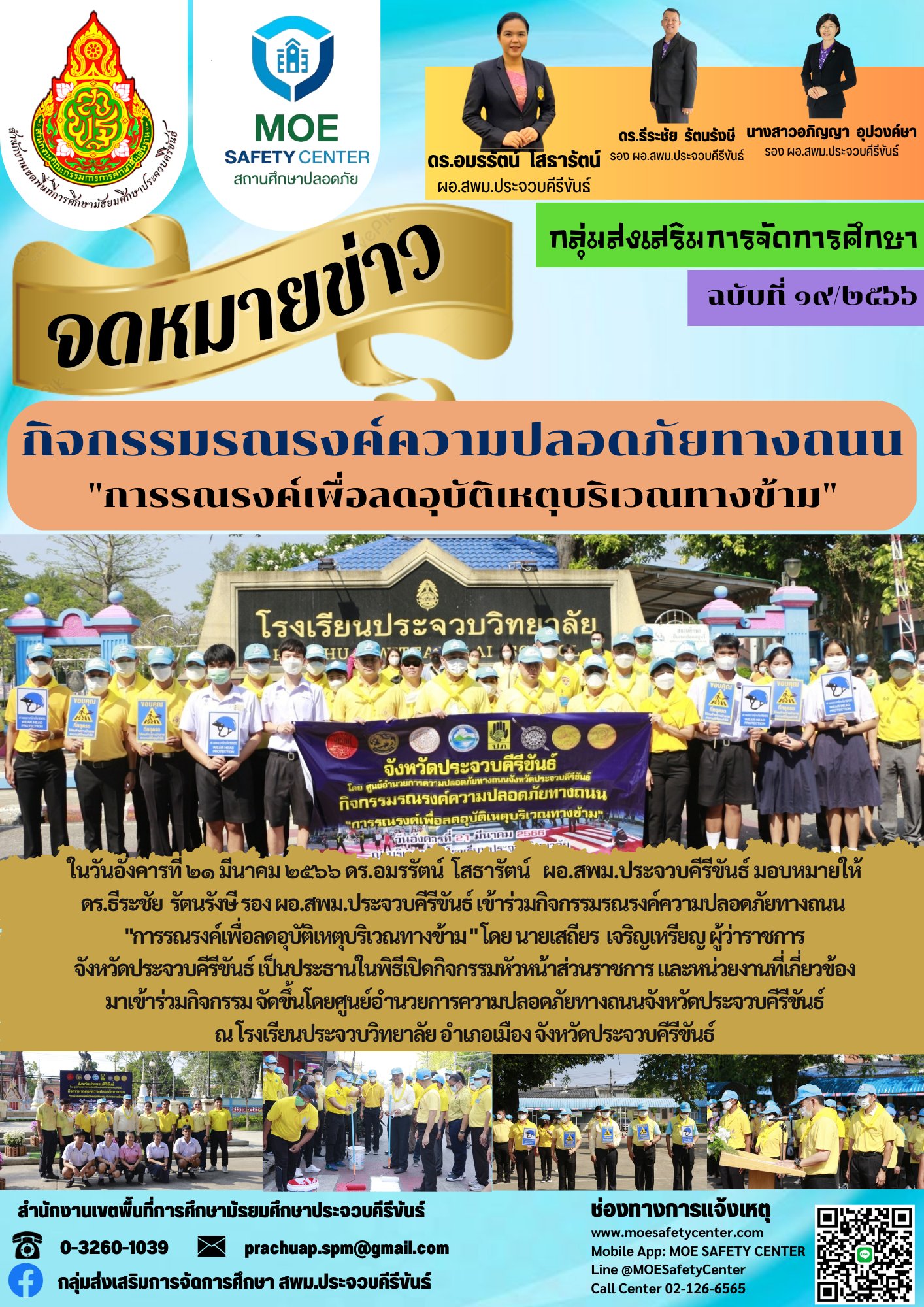 ในวันอังคารที่ ๒๑ มีนาคม ๒๕๖๖ ดร.อมรรัตน์ โสธารัตน์ ผอ.สพม.ประจวบคีรีขันธ์ มอบหมายให้ ดร.ธีระชัย รัตนรังษี รอง ผอ.สพม.ประจวบคีรีขันธ์ เข้าร่วมกิจกรรมรณรงค์ความปลอดภัยทางถนน การรณรงค์เพื่อลดอุบัติเหตุบริเวณทางข้าม โดย นายเสถียร เจริญเหรียญ ผู้ว่าราชการจังหวัดประจวบคีรีขันธ์ เป็นประธานในพิธีเปิดกิจกรรมหัวหน้าส่วนราชการ และหน่วยงานที่เกี่ยวข้องมาเข้าร่วมกิจกรรม จัดขึ้นโดยศูนย์อำนวยการความปลอดภัยทางถนนจังหวัดประจวบคีรีขันธ์ ณ โรงเรียนประจวบวิทยาลัย อำเภอเมือง จังหวัดประจวบคีรีขันธ์