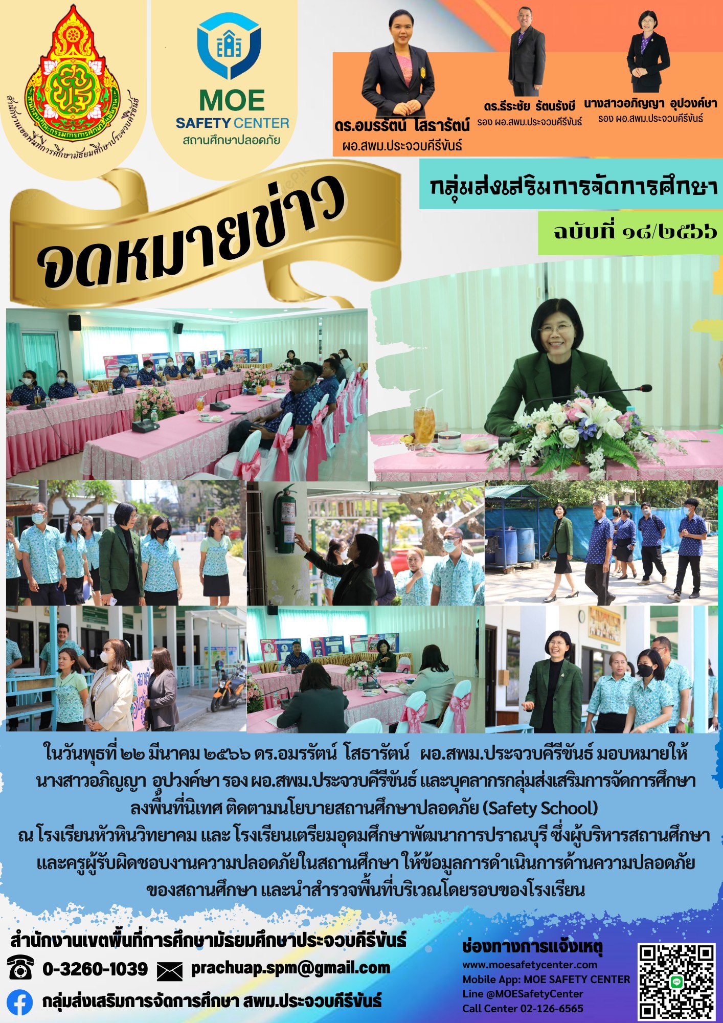 ในวันพุธที่ ๒๒ มีนาคม ๒๕๖๖ ดร.อมรรัตน์ โสธารัตน์ ผอ.สพม.ประจวบคีรีขันธ์ มอบหมายให้ นางสาวอภิญญา อุปวงค์ษา รอง ผอ.สพม.ประจวบคีรีขันธ์ และบุคลากรกลุ่มส่งเสริมการจัดการศึกษาลงพื้นที่นิเทศ ติดตามนโยบายสถานศึกษาปลอดภัย (Safety School) ณ โรงเรียนหัวหินวิทยาคม และ โรงเรียนเตรียมอุดมศึกษาพัฒนาการปราณบุรี ซึ่งผู้บริหารสถานศึกษา และครูผู้รับผิดชอบงานความปลอดภัยในสถานศึกษา ให้ข้อมูลการดำเนินการด้านความปลอดภัยของสถานศึกษา และนำสำรวจพื้นที่บริเวณโดยรอบของโรงเรียน