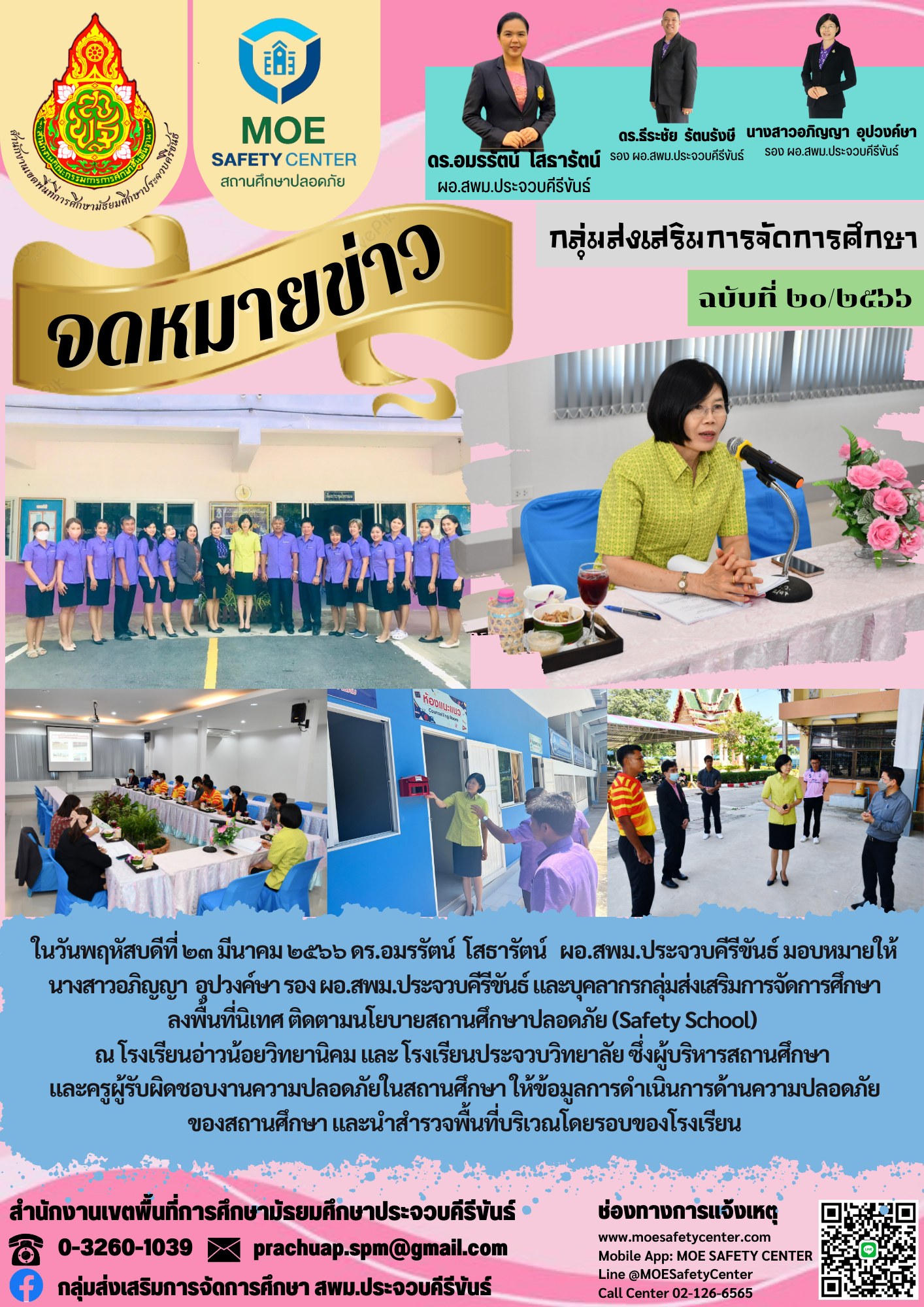 ในวันพฤหัสบดีที่ ๒๓ มีนาคม ๒๕๖๖ ดร.อมรรัตน์ โสธารัตน์ ผอ.สพม.ประจวบคีรีขันธ์ มอบหมายให้นางสาวอภิญญา อุปวงค์ษา รองผอ.สพม.ประจวบคีรีขันธ์ และบุคลากรกลุ่มส่งเสริมการจัดการศึกษา ลงพื้นที่นิเทศ ติดตามนโยบายสถานศึกษาปลอดภัย (Safety School) ณ โรงเรียนอ่าวน้อยวิทยานิคม และ โรงเรียนประจวบวิทยาลัย ซึ่งผู้บริหารสถานศึกษา และครูผู้รับผิดชอบงานความปลอดภัยในสถานศึกษา ให้ข้อมูลการดำเนินการด้านความปลอดภัยของสถานศึกษา และนำสำรวจพื้นที่บริเวณโดยรอบของโรงเรียน