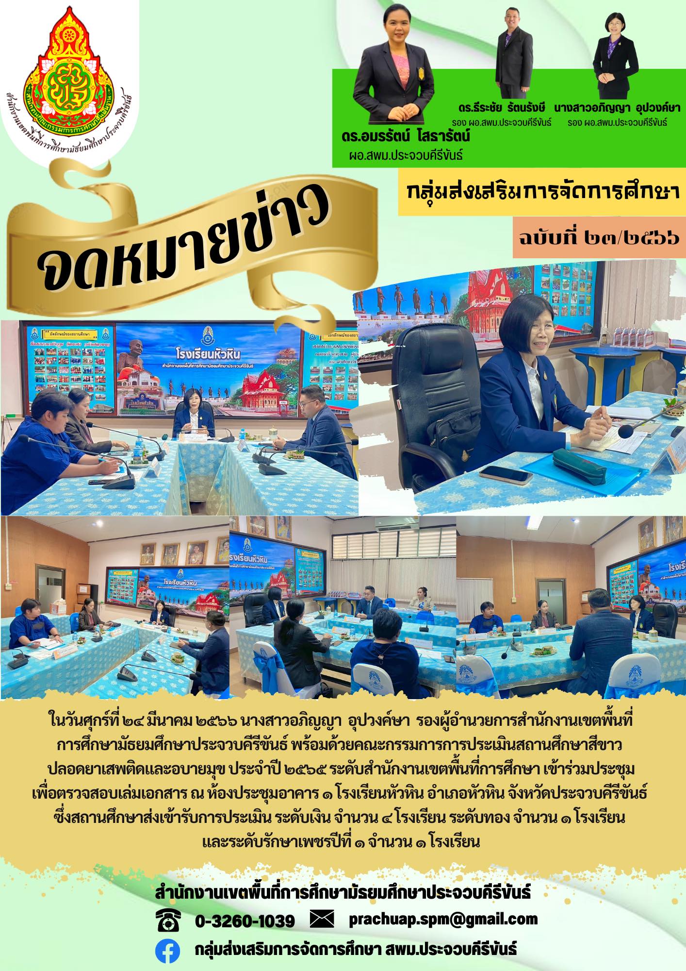 ในวันศุกร์ที่ ๒๔ มีนาคม ๒๕๖๖ นางสาวอภิญญา อุปวงค์ษา รองผู้อำนวยการสำนักงานเขตพื้นที่การศึกษามัธยมศึกษาประจวบคีรีขันธ์ พร้อมด้วยคณะกรรมการการประเมินสถานศึกษาสีขาว ปลอดยาเสพติดและอบายมุข ประจำปี ๒๕๖๕ ระดับสำนักงานเขตพื้นที่การศึกษา เข้าร่วมประชุมเพื่อตรวจสอบเล่มเอกสาร ณ ห้องประชุมอาคาร ๑ โรงเรียนหัวหิน อำเภอหัวหิน จังหวัดประจวบคีรีขันธ์ ซึ่งสถานศึกษาส่งเข้ารับการประเมิน ระดับเงิน จำนวน ๔ โรงเรียน ระดับทอง จำนวน ๑ โรงเรียน และระดับรักษาเพชรปีที่ ๑ จำนวน ๑ โรงเรียน