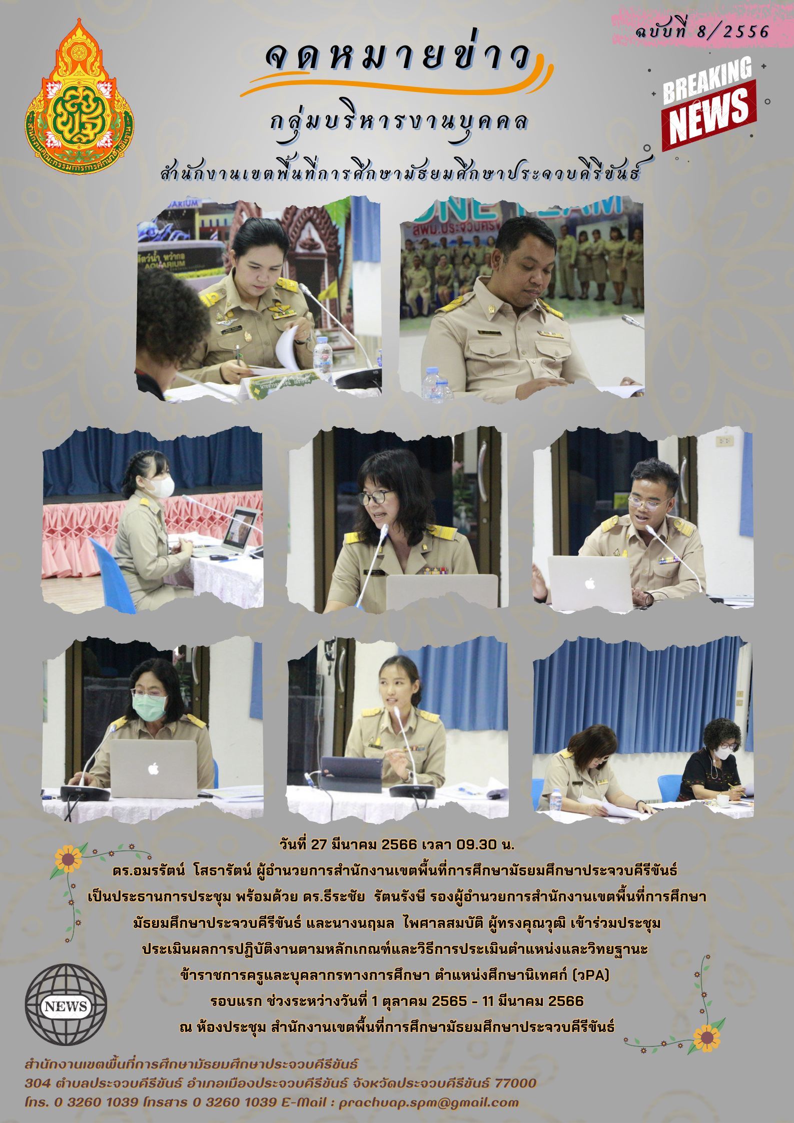วันที่ 27 มีนาคม 2566 เวลา 09.30 น. ดร.อมรรัตน์ โสธารัตน์ ผอ.สพม.ประจวบคีรีขันธ์ เป็นประธานการประชุม พร้อมด้วย ดร.ธีระชัย รัตนรังษี รอง ผอ.สพม.ประจวบคีรีขันธ์ และนางนฤมล ไพศาลสมบัติ ผู้ทรงคุณวุฒิ เข้าร่วมประชุมประเมินผลการปฏิบัติงานตามหลักเกณฑ์และวิธีการประเมินตำแหน่งและวิทยฐานะข้าราชการครูและบุคลากรทางการศึกษา ตำแหน่งศึกษานิเทศก็ (วPA) รอบแรก ช่วงระหว่างวันที่ 1 ตุลาคม 2565 - 11 มีนาคม 2566 ณ ห้องประชุม สำนักงานเขตพื้นที่การศึกษามัธยมศึกษาประจวบคีรีขันธ์