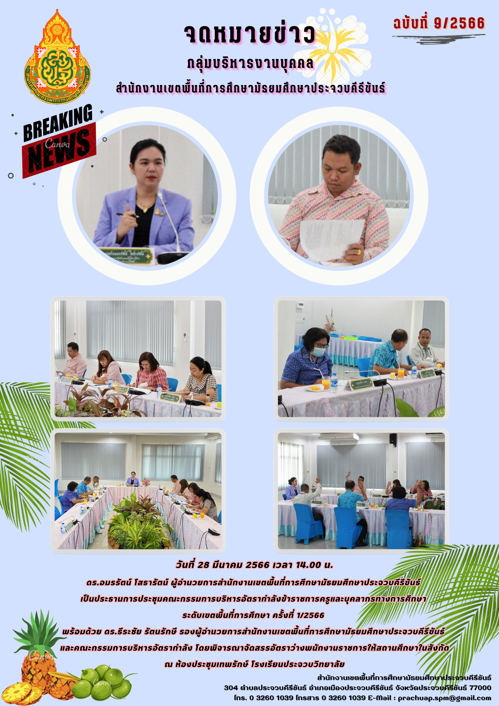 วันที่ 28 มีนาคม 2566 เวลา 14.00 น. ดร.อมรรัตน์ โสธารัตน์ ผู้อำนวยการสำนักงานเขตพื้นที่การศึกษามัธยมศึกษาประจวบคีรีขันธ์ เป็นประธานการประชุมคณะกรรมการบริหารอัตรากำลังข้าราชการครูและบุคลากรทางการศึกษา ระดับเขตพื้นที่การศึกษา ครั้งที่ 1/2566 พร้อมด้วย ดร.ธีระชัย รัตนรักษี รองผู้อำนวยการสำนักงานเขตพื้นที่การศึกษามัธยมศึกษาประจวบคีรีขันธ์ และคณะกรรมการบริหารอัตรากำลัง โดยพิจารณาจัดสรรอัตราว่างพนักงานราชการให้สถานศึกษาในสังกัด ณ ห้องประชุมเทพรักษ์ โรงเรียนประจวบวิทยาลัย