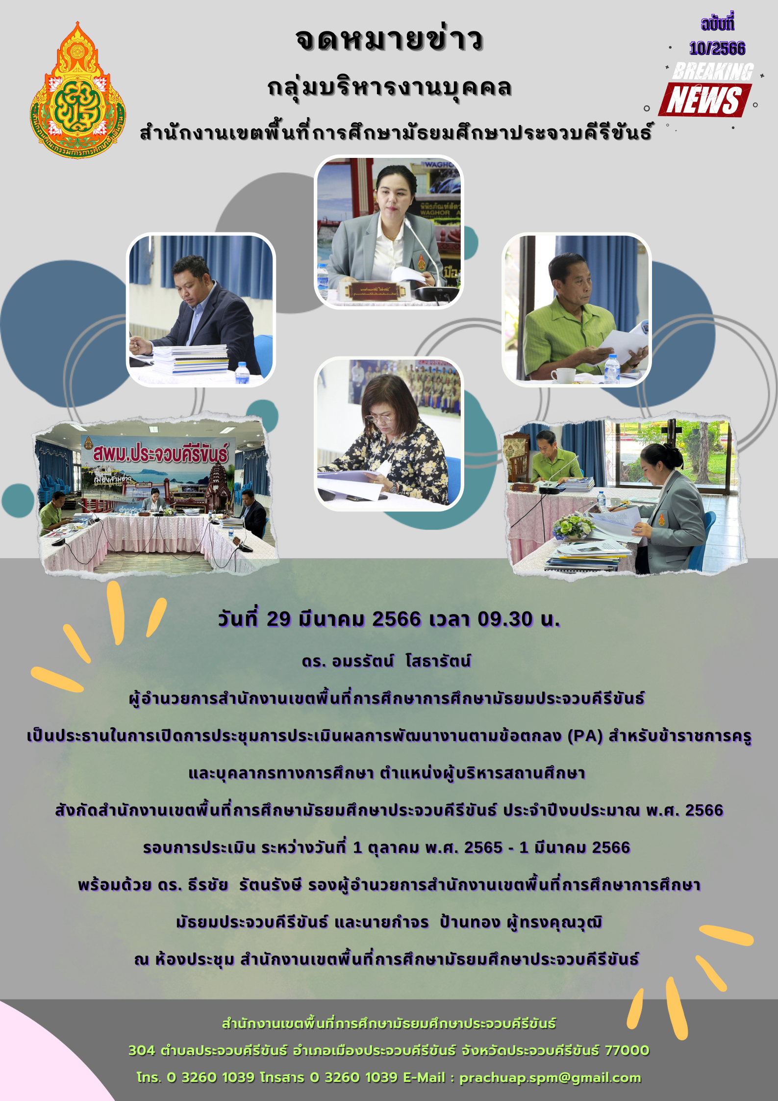 วันที่ 29 มีนาคม 2566 เวลา 09.30 น. ดร. อมรรัตน์ โสธารัตน์ ผู้อำนวยการสำนักงานเขตพื้นที่การศึกษาการศึกษามัธยมประจวบคีรีขันธ์ เป็นประธานในการเปิดการประชุมการประเมินผลการพัฒนางานตามข้อตกลง (PA) สำหรับข้าราชการครูและบุคลากรทางการศึกษา ตำแหน่งผู้บริหารสถานศึกษา สังกัดสำนักงานเขตพื้นที่การศึกษามัธยมศึกษาประจวบคีรีขันธ์ ประจำปีงบประมาณ พ.ศ. 2566 รอบการประเมิน ระหว่างวันที่ 1 ตุลาคม พ.ศ. 2565 - 1 มีนาคม 2566 พร้อมด้วย ดร. ธีรชัย รัตนรังษี รองผู้อำนวยการสำนักงานเขตพื้นที่การศึกษาการศึกษามัธยมประจวบคีรีขันธ์ และนายกำจร ป้านทอง ผู้ทรงคุณวุฒิ ณ ห้องประชุม สำนักงานเขตพื้นที่การศึกษามัธยมศึกษาประจวบคีรีขันธ์