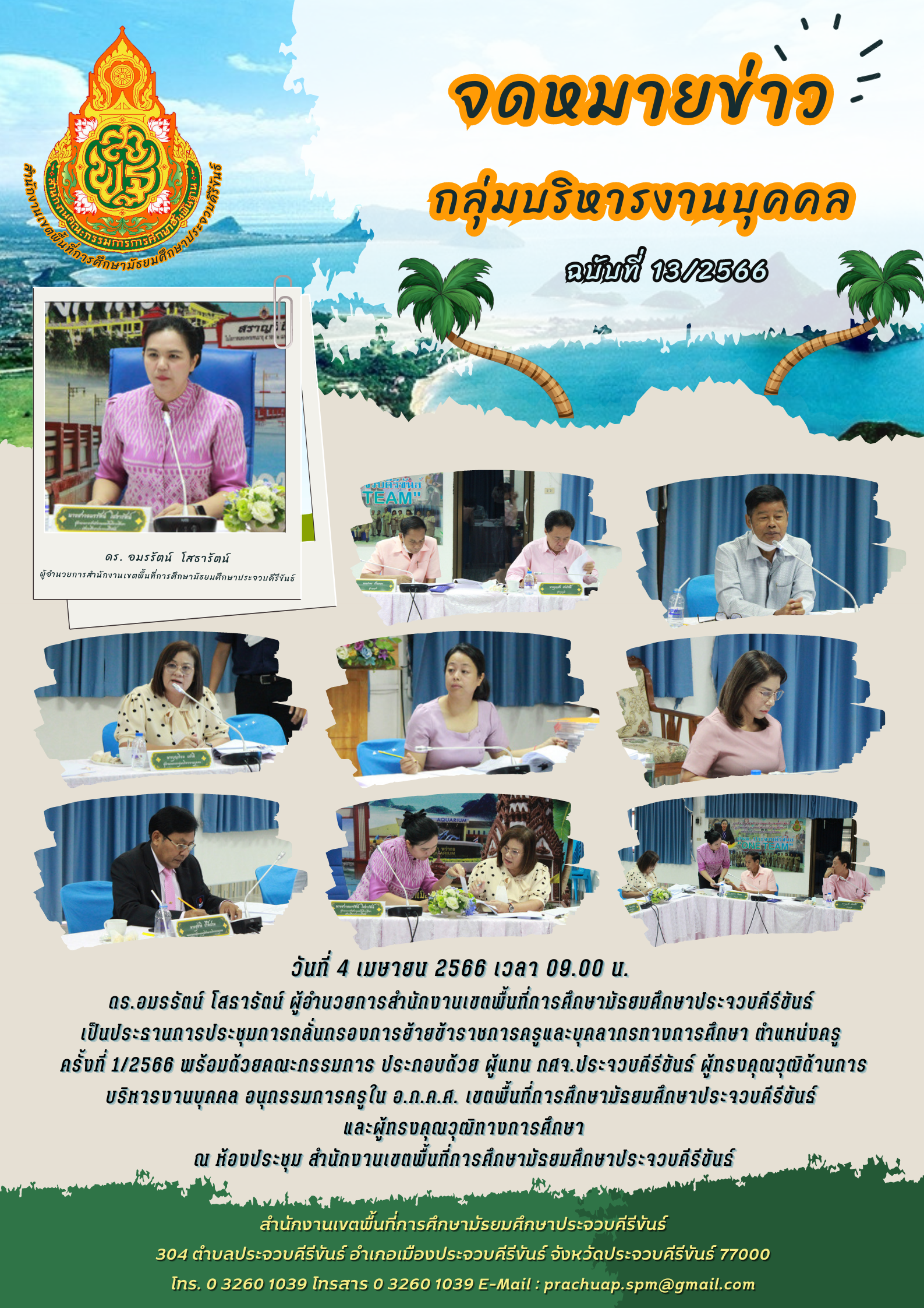 วันที่ 4 เมษายน 2566 เวลา 09.00 น. ดร.อมรรัตน์ โสธารัตน์ ผู้อำนวยการสำนักงานเขตพื้นที่การศึกษามัธยมศึกษาประจวบคีรีขันธ์ เป็นประธานการประชุมการกลั่นกรองการย้ายข้าราชการครูและบุคลากรทางการศึกษา ตำแหน่งครู ครั้งที่ 1/2566 พร้อมด้วยคณะกรรมการ ประกอบด้วย ผู้แทน กศจ.ประจวบคีรีขันธ์ ผู้ทรงคุณวุฒิด้านการบริหารงานบุคคล อนุกรรมการครูใน อ.ก.ค.ศ. เขตพื้นที่การศึกษามัธยมศึกษาประจวบคีรีขันธ์ และผู้ทรงคุณวุฒิทางการศึกษา ณ ห้องประชุม สำนักงานเขตพื้นที่การศึกษามัธยมศึกษาประจวบคีรีขันธ์