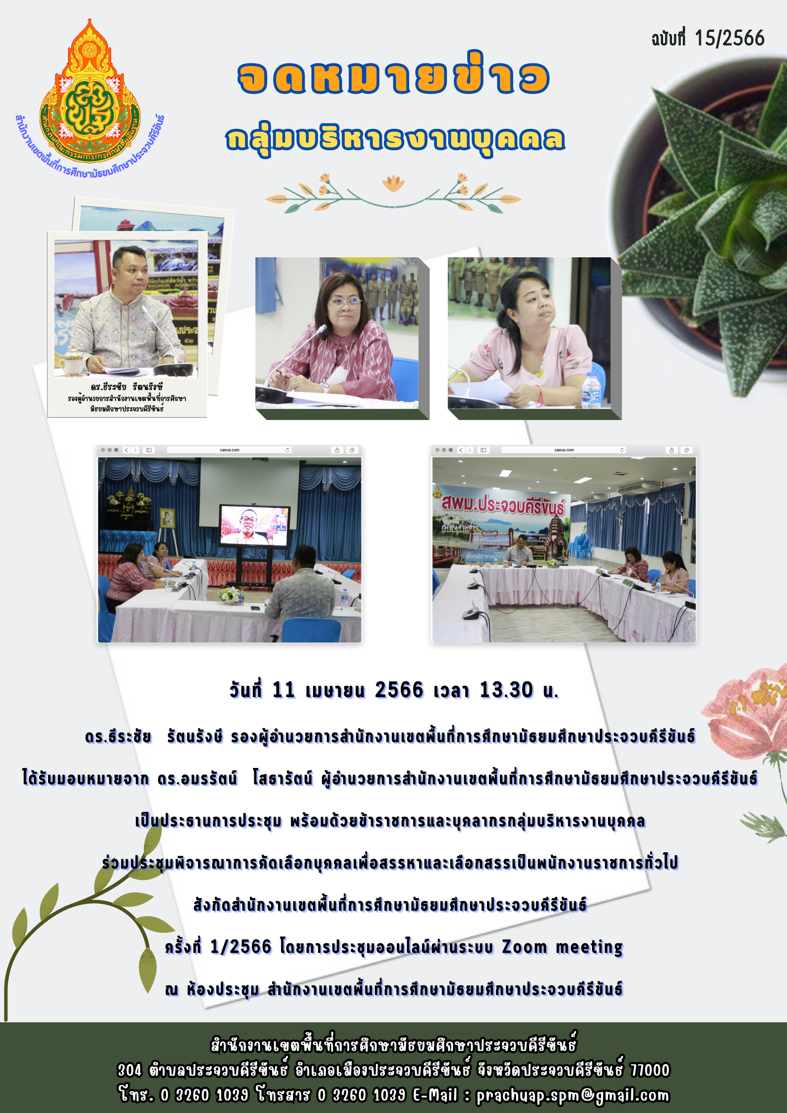 วันที่ 11 เมษายน 2566 เวลา 13.30 น. ดร.ธีระชัย รัตนรังษี รองผู้อำนวยการสำนักงานเขตพื้นที่การศึกษามัธยมศึกษาประจวบคีรีขันธ์ ได้รับมอบหมายจาก ดร.อมรรัตน์ โสธารัตน์ ผู้อำนวยการสำนักงานเขตพื้นที่การศึกษามัธยมศึกษาประจวบคีรีขันธ์ เป็นประธานการประชุม พร้อมด้วยข้าราชการและบุคลากรกลุ่มบริหารงานบุคคล ร่วมประชุมพิจารณาการคัดเลือกบุคคลเพื่อสรรหาและเลือกสรรเป็นพนักงานราชการทั่วไปสังกัดสำนักงานเขตพื้นที่การศึกษามัธยมศึกษาประจวบคีรีขันธ์ ครั้งที่ 1/2566 โดยการประชุมออนไลน์ผ่านระบบ Zoom meeting ณ ห้องประชุม สำนักงานเขตพื้นที่การศึกษามัธยมศึกษาประจวบคีรีขันธ์