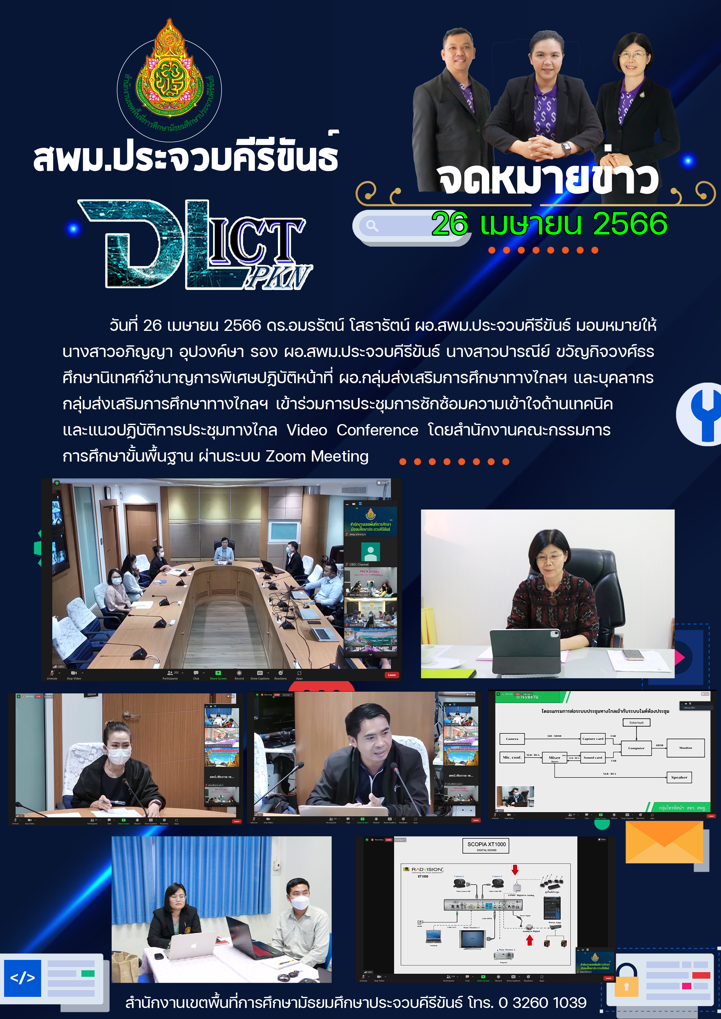 วันที่ 26 เมษายน 2566 ดร.อมรรัตน์ โสธารัตน์ ผอ.สพม.ประจวบคีรีขันธ์ มอบหมายให้ นางสาวอภิญญา อุปวงค์ษา รอง ผอ.สพม.ประจวบคีรีขันธ์ นางสาวปารณีย์ ขวัญกิจวงศ์ธร ศึกษานิเทศก์ชำนาญการพิเศษปฏิบัติหน้าที่ ผอ.กลุ่มส่งเสริมการศึกษาทางไกลฯ และบุคลากรกลุ่มส่งเสริมการศึกษาทางไกลฯ เข้าร่วมการประชุมการซักซ้อมความเข้าใจด้านเทคนิคและแนวปฏิบัติการประชุมทางไกล Video Conference โดยสำนักงานคณะกรรมการการศึกษาขั้นพื้นฐาน ผ่านระบบ Zoom Meeting